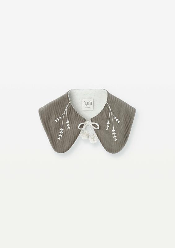 Embroidered corduroy collar. Front fastening with drawstring and hand crafted pompom. Contrasting lining in wool.