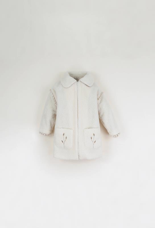 Coat with embroidered pockets, tasselled sleeves and cuffs. Zipped opening on the front. 100% organic cotton lining.