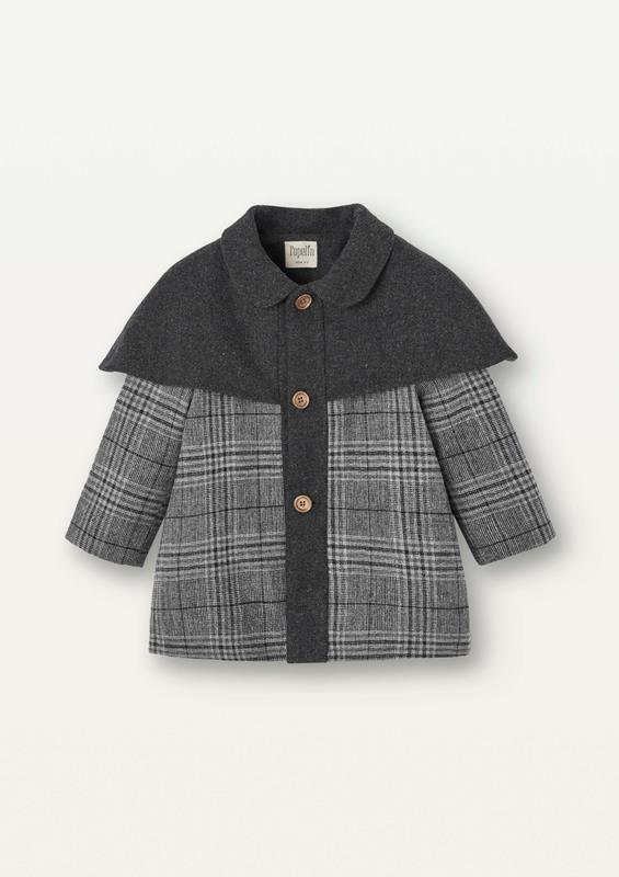 Flared coat with baby collar and cape. Front opening with wooden buttons. Contrasting lining in 100% organic cotton.