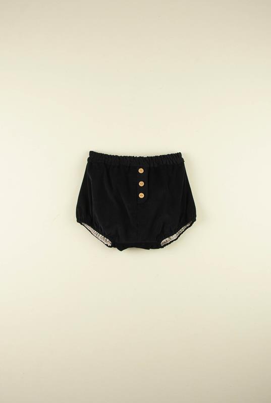 Culotte with placket and natural wood buttons. Elasticated waist. 100% organic cotton lining.