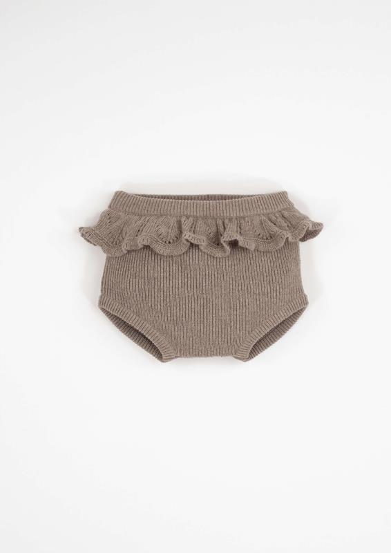Knitted culotte with frill on waist. Adjustable elasticated knitted legs. Exclusive design knitted in Spain using cashmere and top-quality wool.