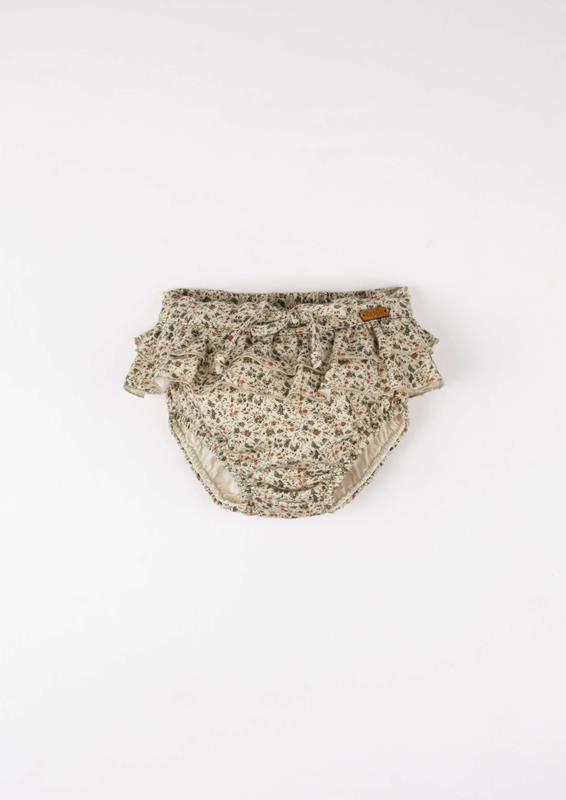 Culotte with double frill and adjustable drawstring waist with elastic at the back. Elasticated legs. 100% organic cotton lining.