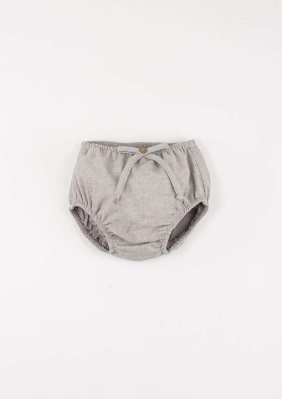 Baby culotte with elasticated legs and waist. Tie and button detail. 100% organic cotton lining.