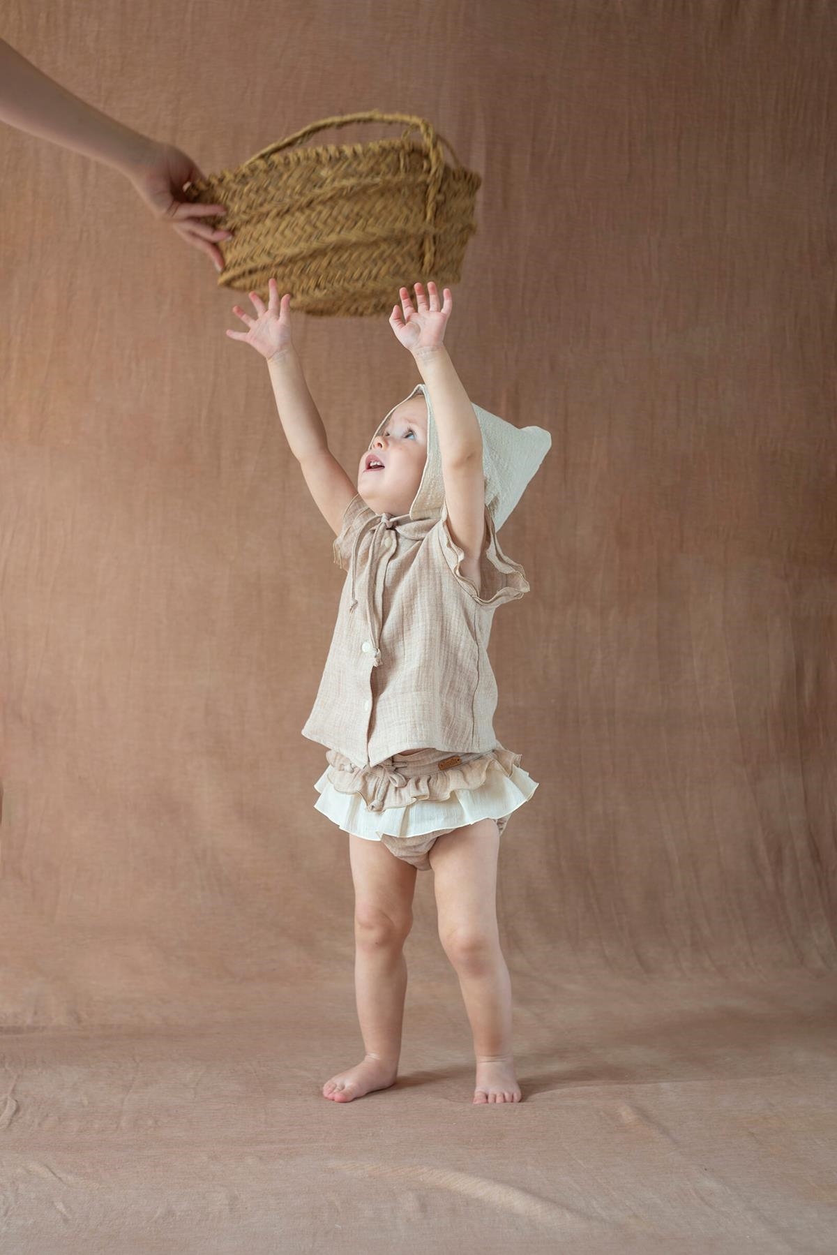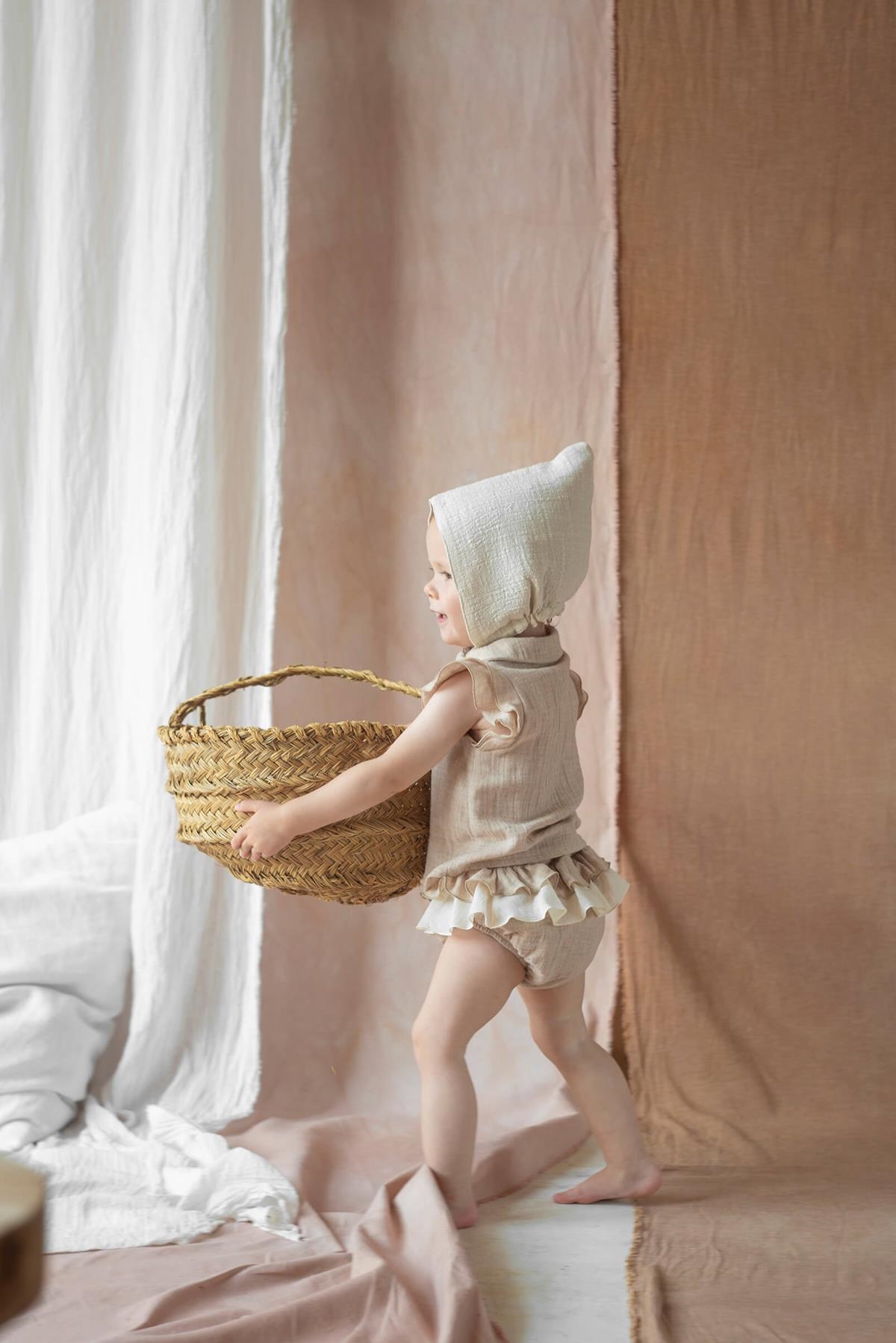 Culotte with double frill, adjustable drawstring waist and elastic at the back. Elasticated legs. 100% organic cotton lining.