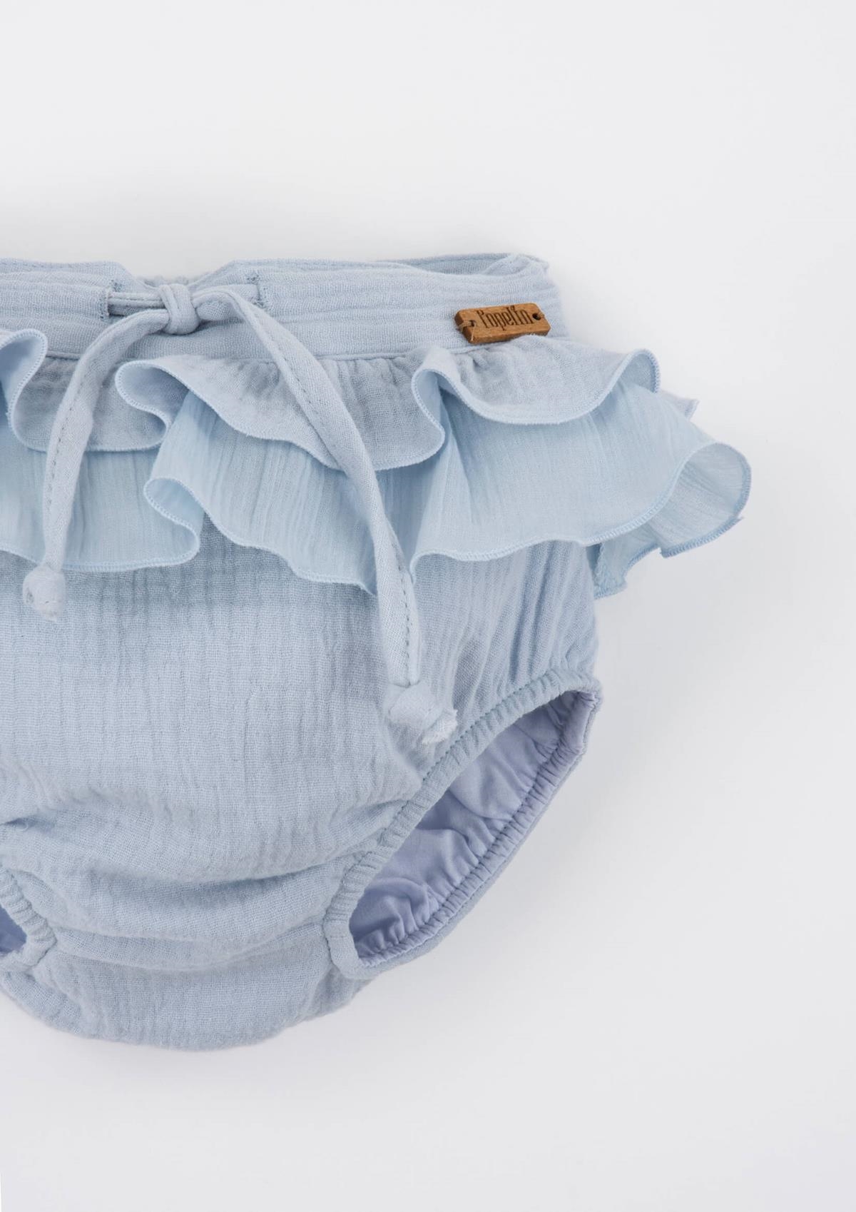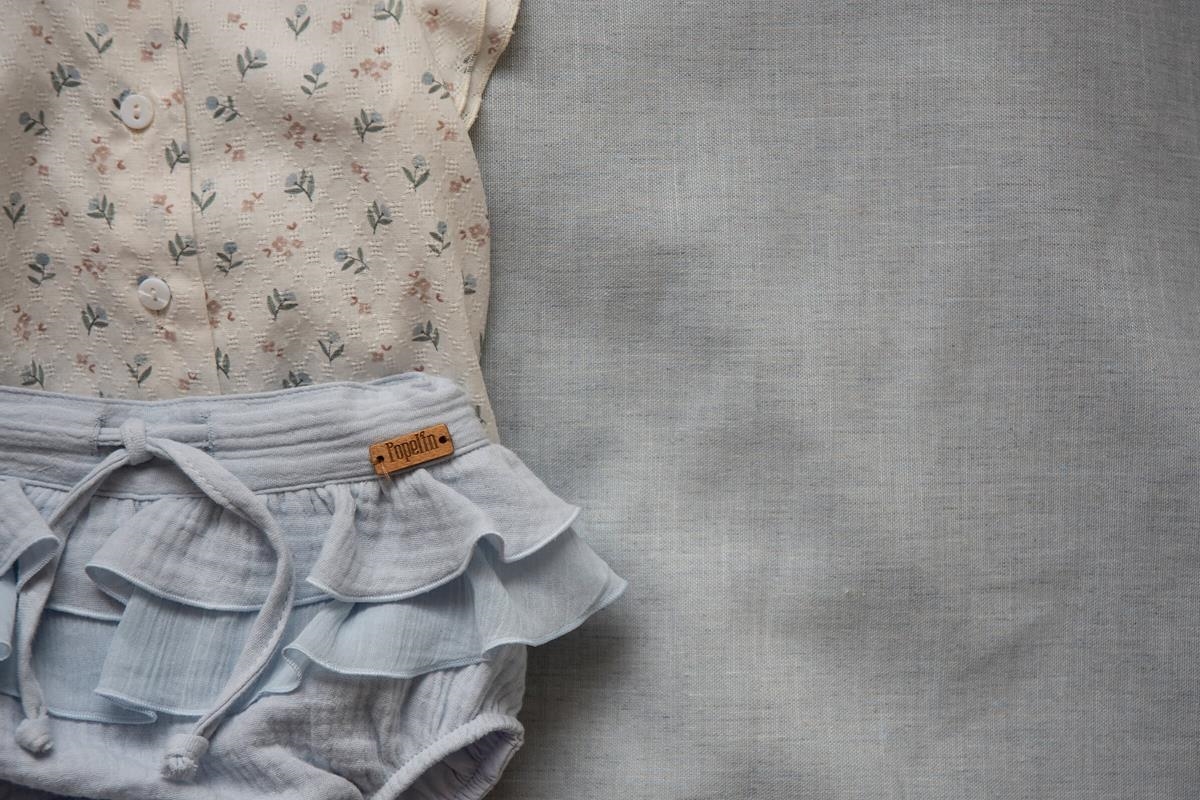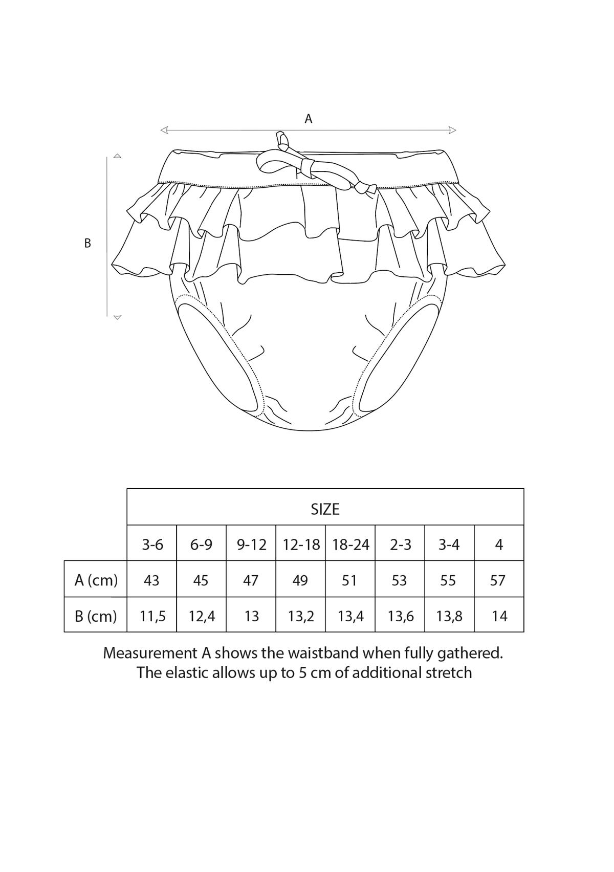 Culotte with double frill, adjustable drawstring waist and elastic at the back. Elasticated legs. 100% organic cotton lining.