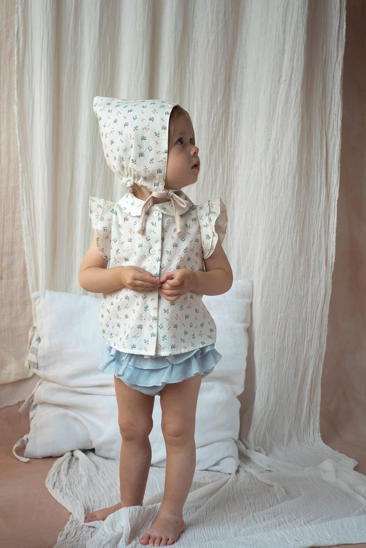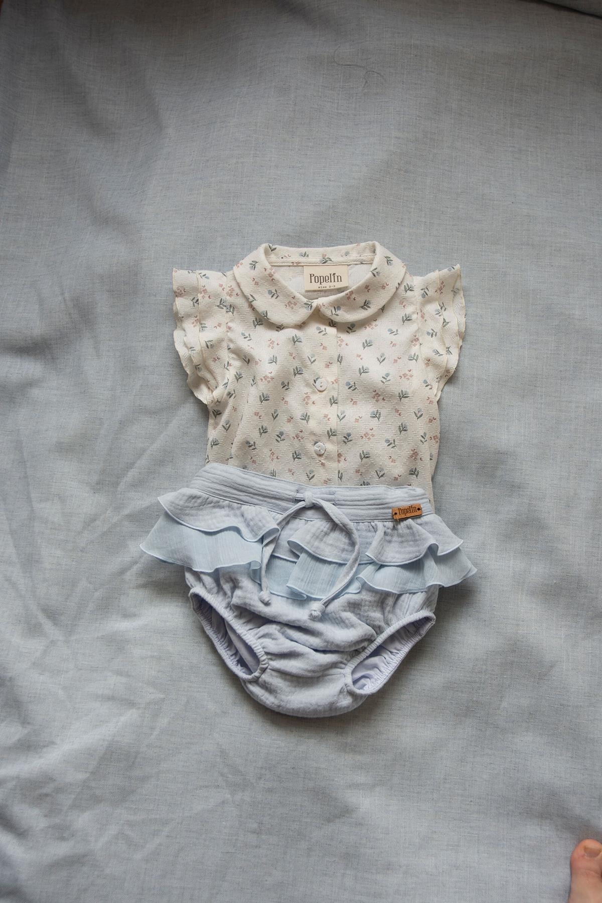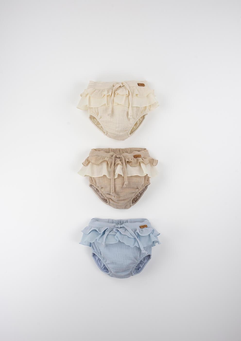 Culotte with double frill, adjustable drawstring waist and elastic at the back. Elasticated legs. 100% organic cotton lining.