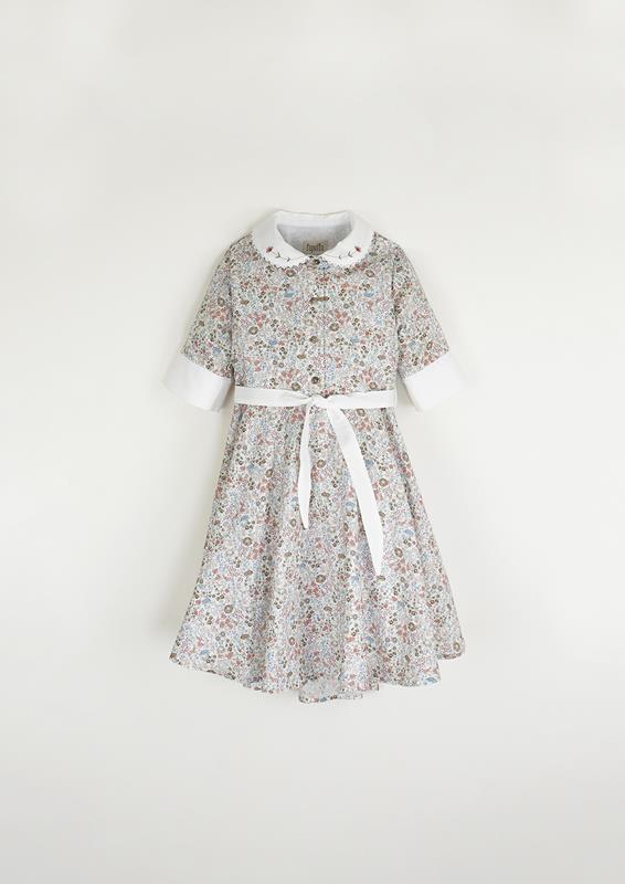 Cape-style dress with a crafted floral embroidery baby-style collar. Contrasting belt and cuffs. Lace trim on the neckline and cuffs. Buttoned front opening. 100% organic cotton lining.
