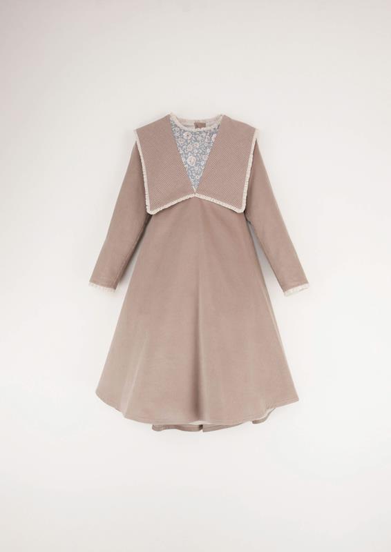 Contrasting long-sleeved corduroy cape-style dress with maxi bib collar. Frill detail on the neck, bib and sleeves. Longer skirt at the back. Button opening on the back. 100% organic cotton lining.