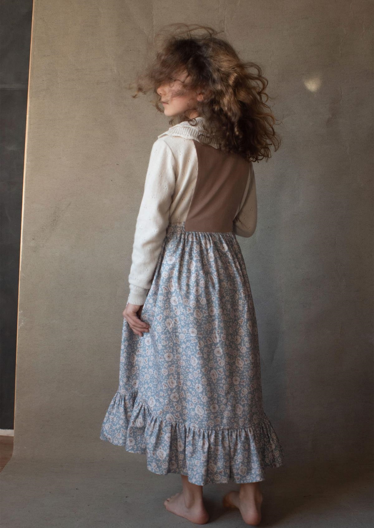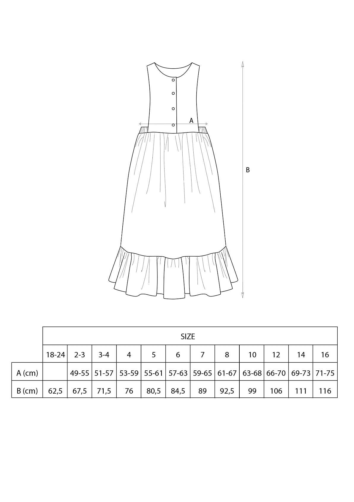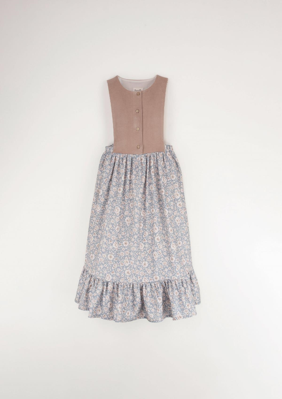 Midi dungaree dress with contrasting body and frill on the skirt. Gathered waist on the sides. Wooden button opening on the front. 100% organic cotton lining.