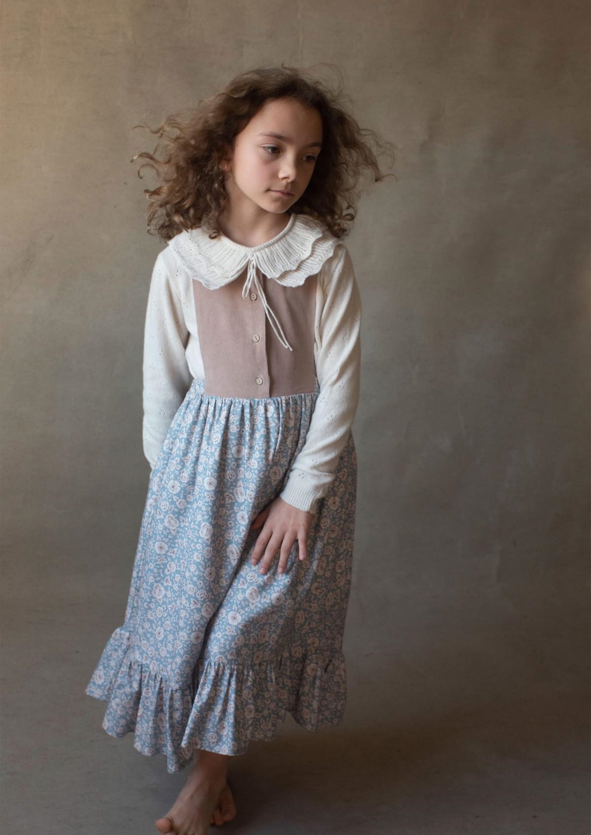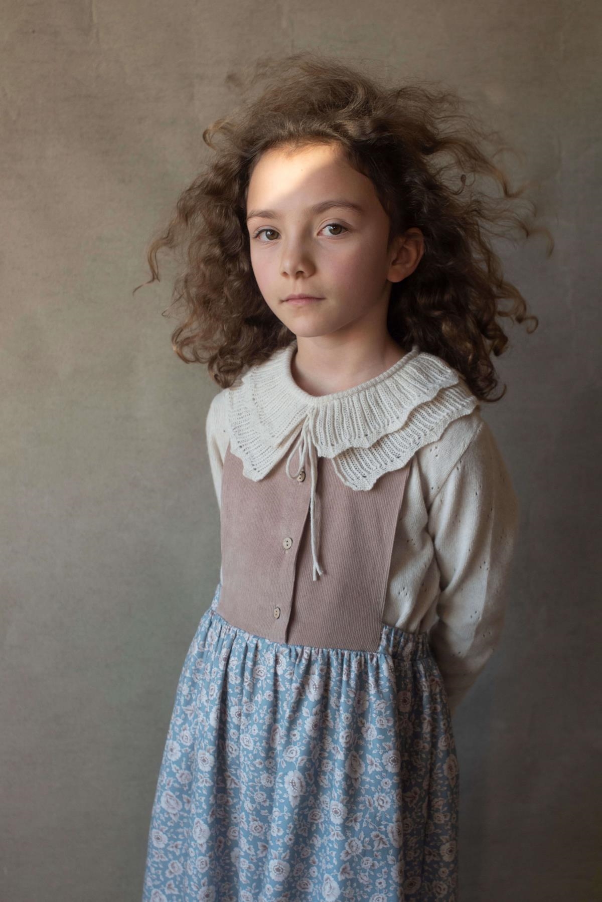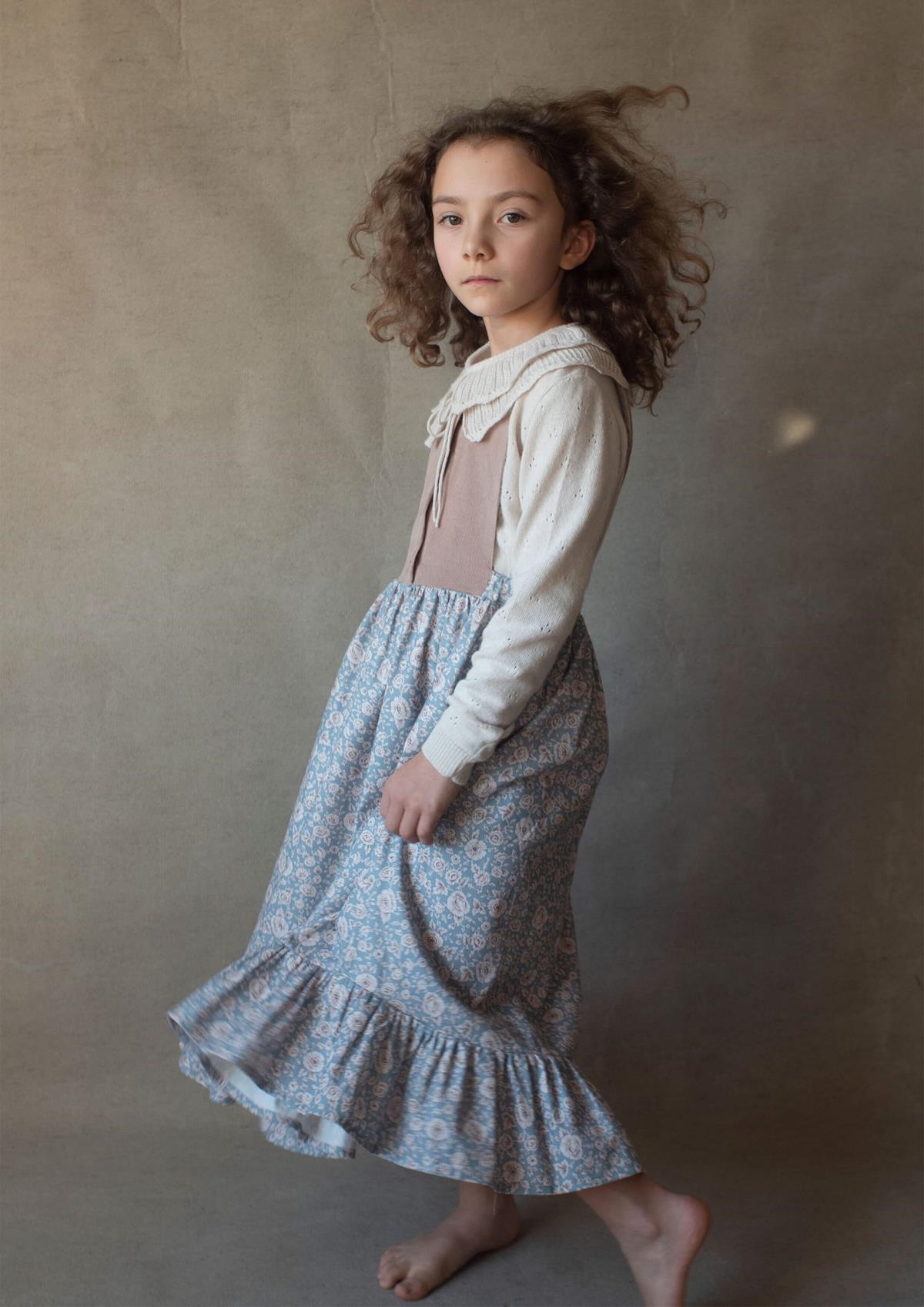 Midi dungaree dress with contrasting body and frill on the skirt. Gathered waist on the sides. Wooden button opening on the front. 100% organic cotton lining.