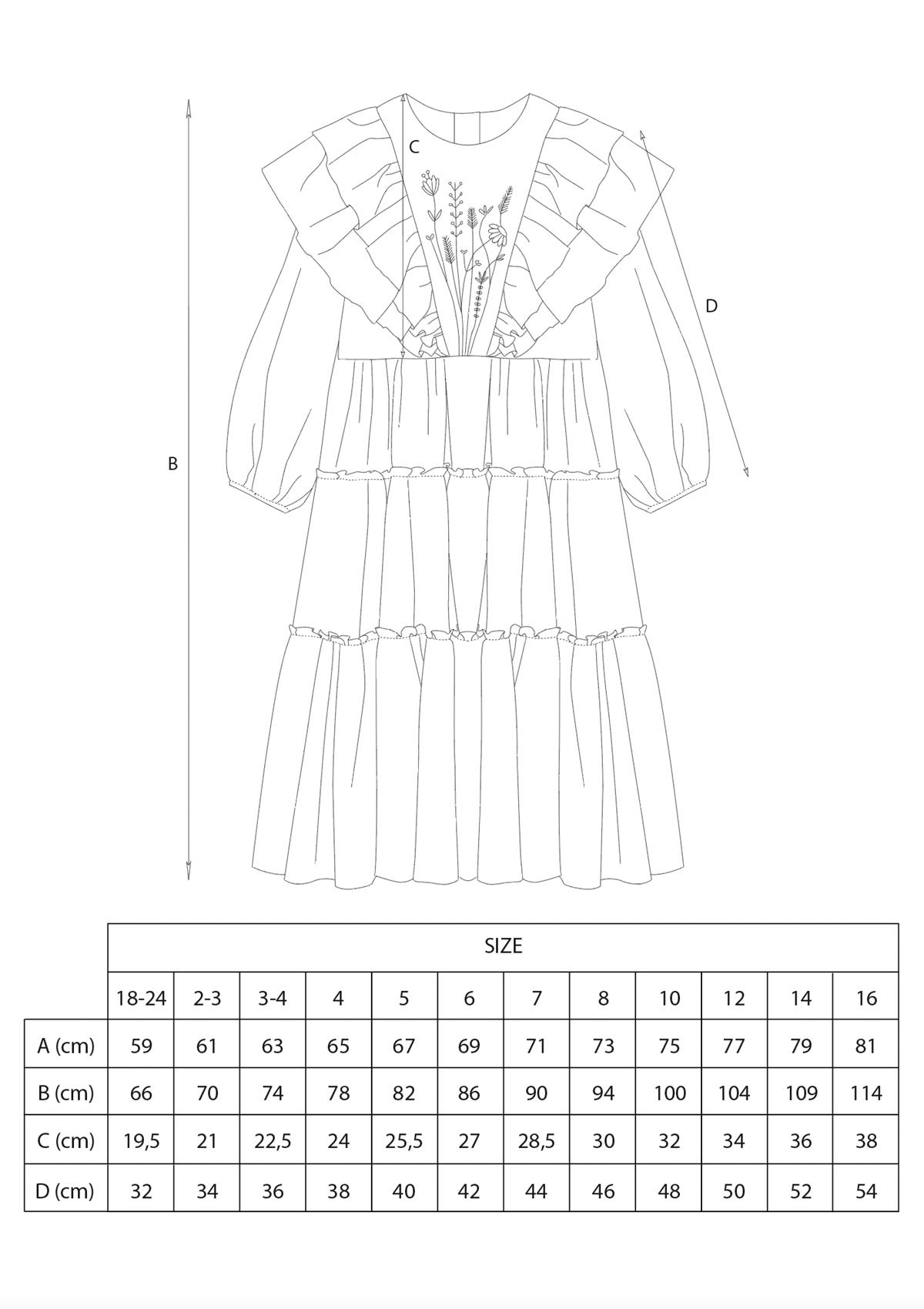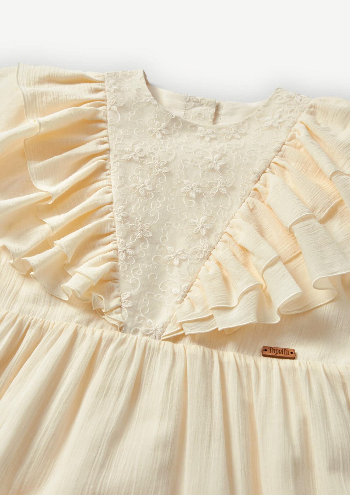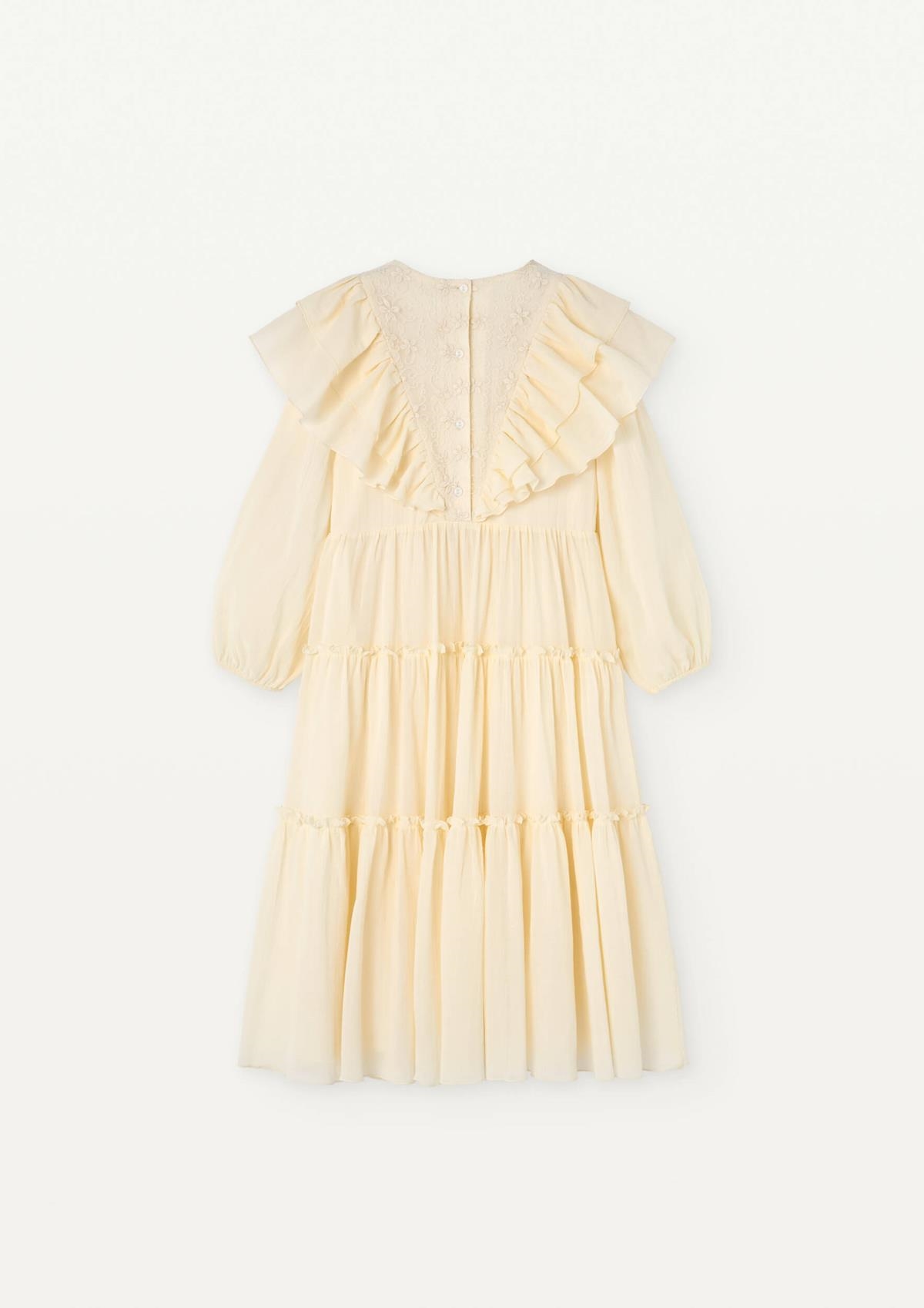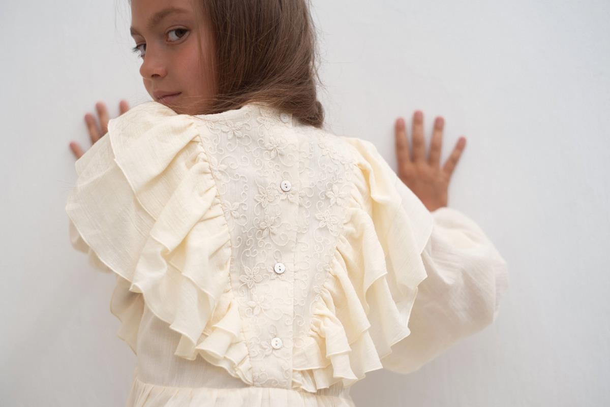 Long-sleeved gauze dress with floral embroidery tulle triangular yoke. Frills on the yoke. Frilled skirt. 100% organic cotton lining