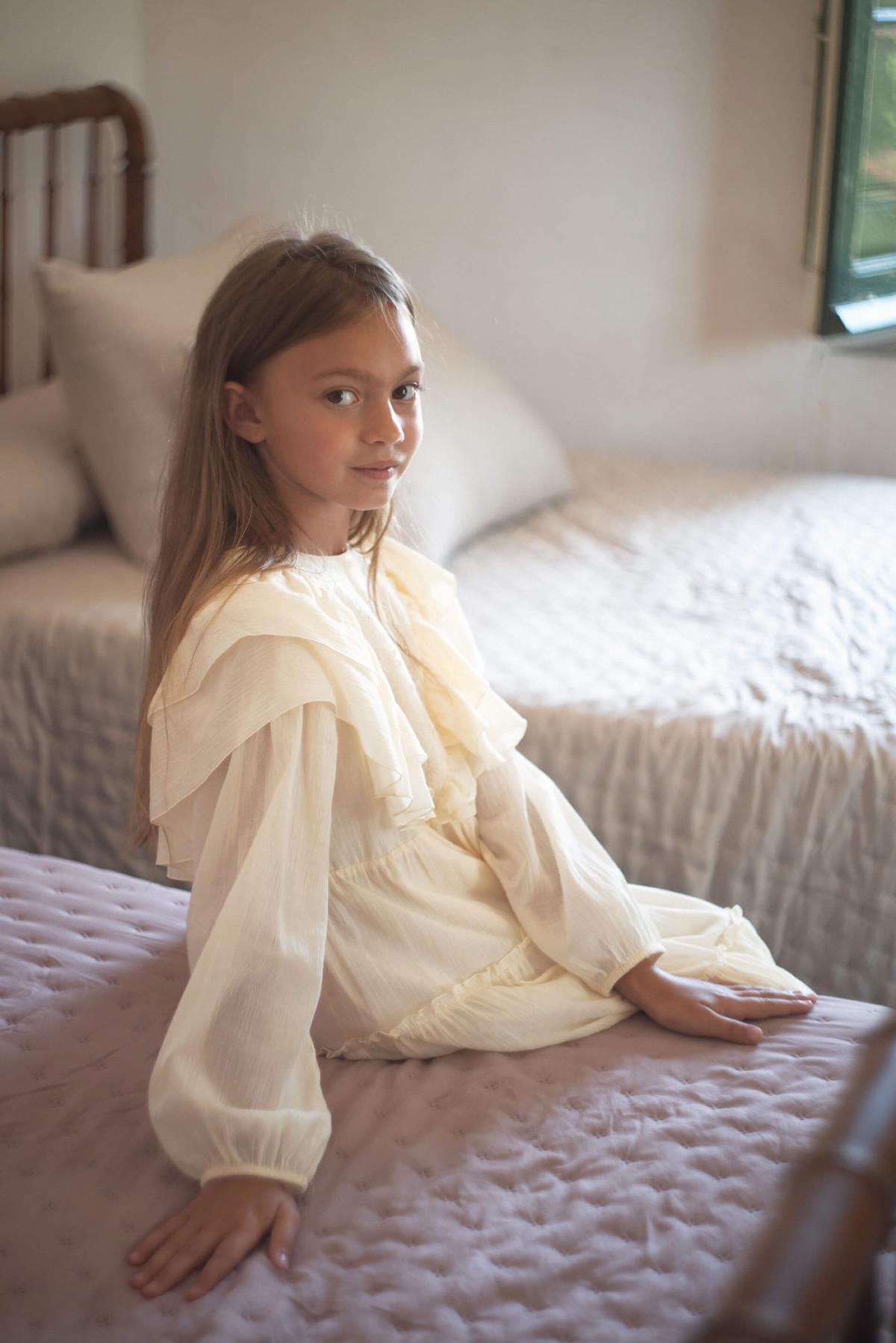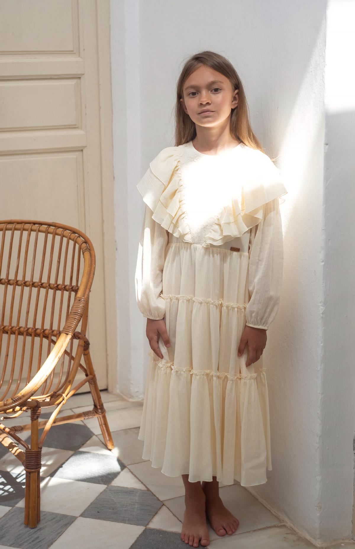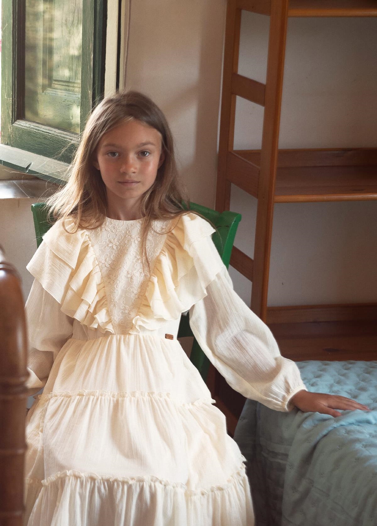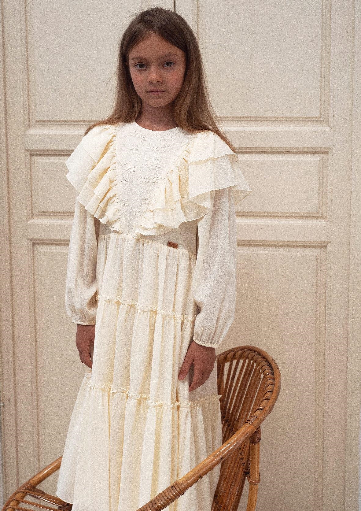 Long-sleeved gauze dress with floral embroidery tulle triangular yoke. Frills on the yoke. Frilled skirt. 100% organic cotton lining