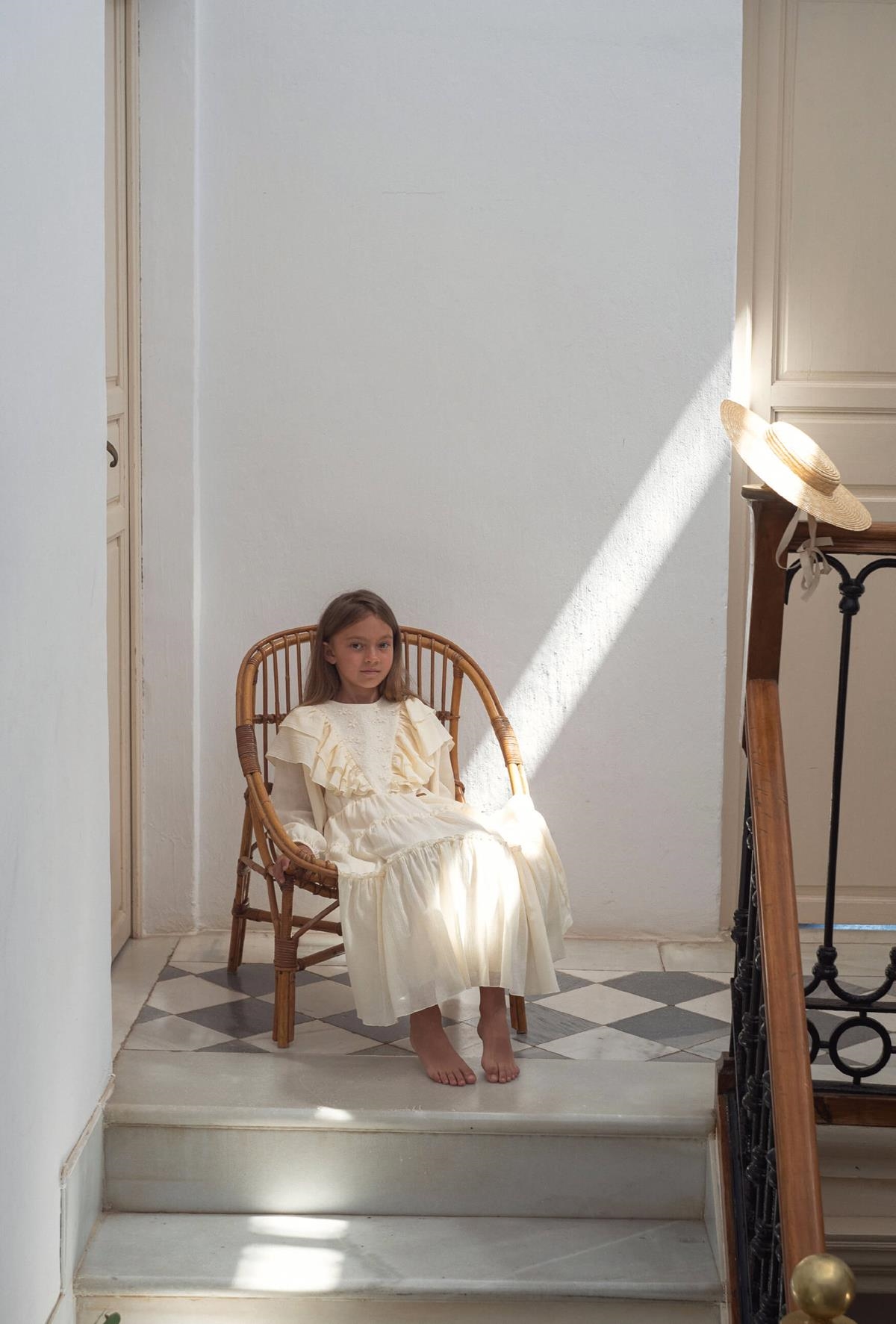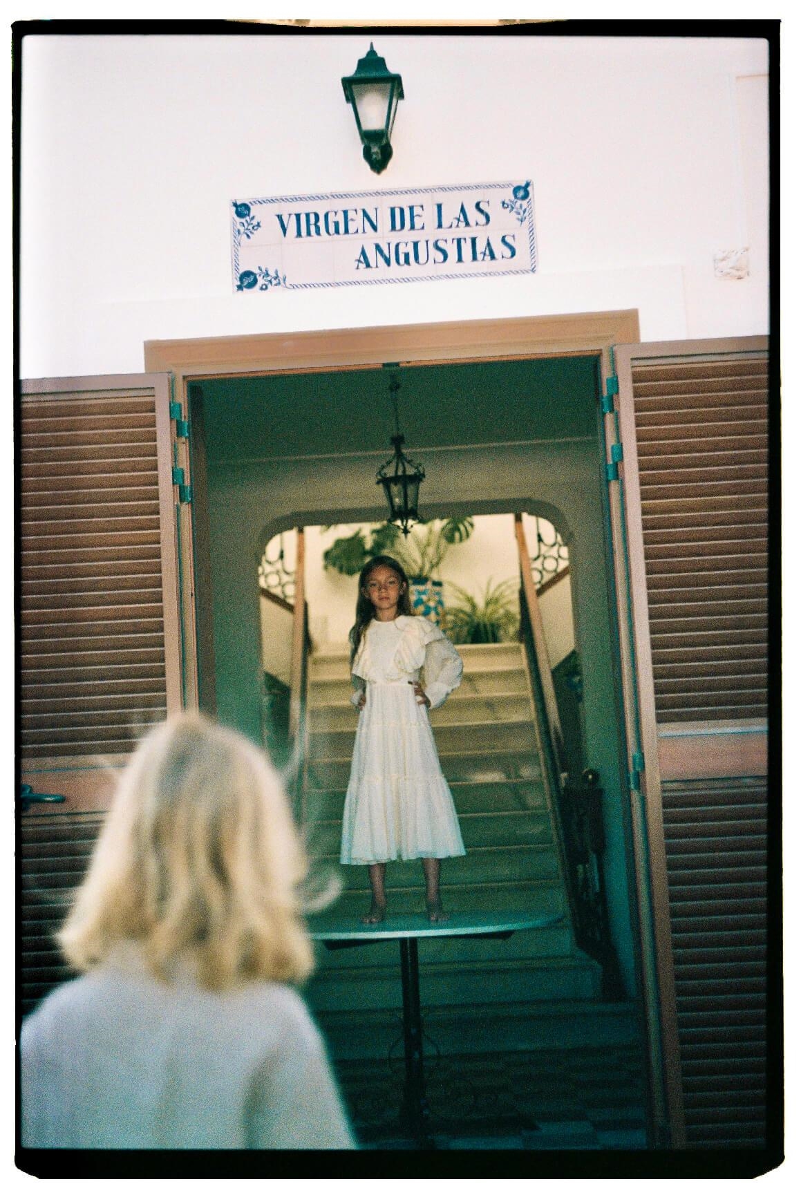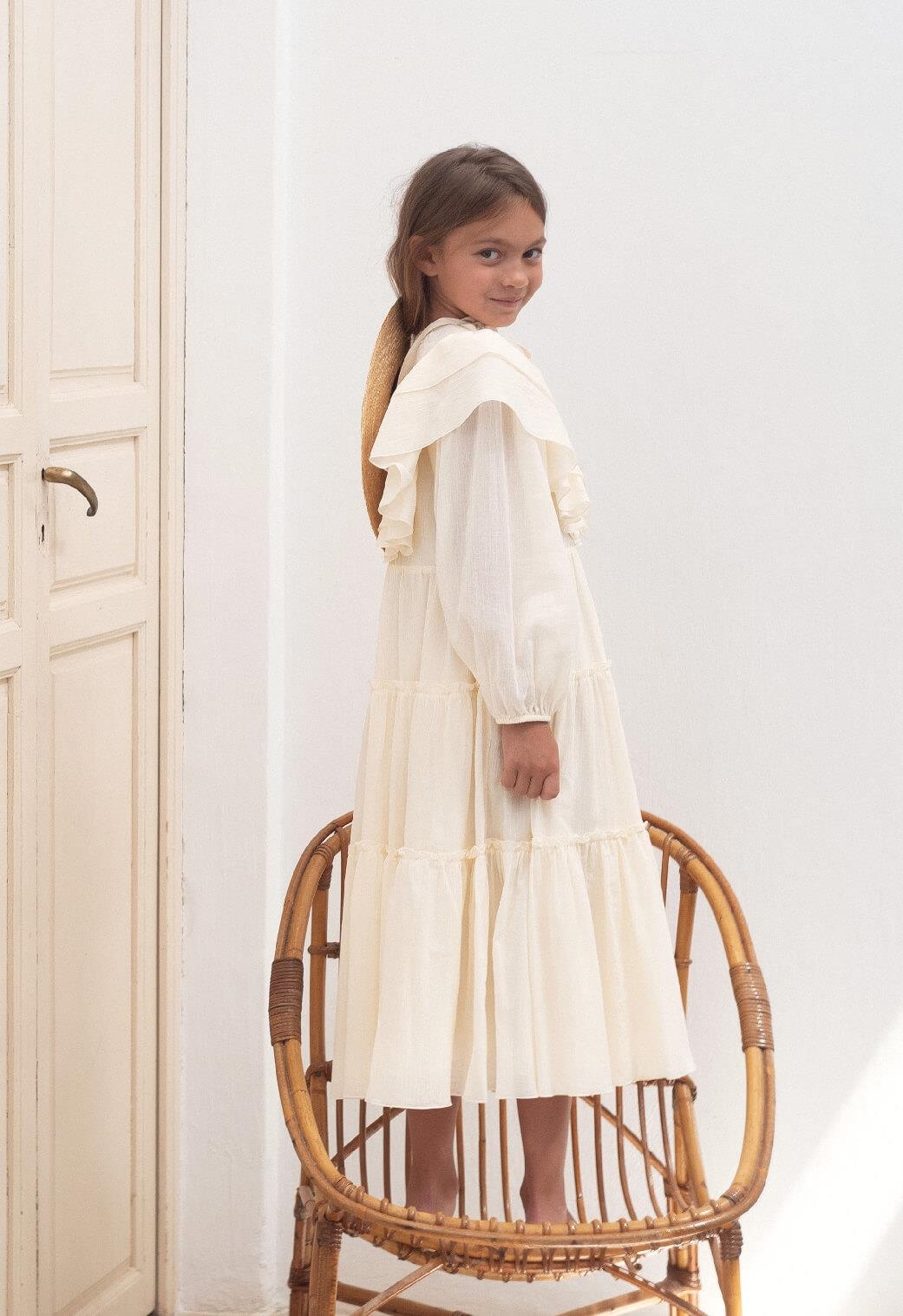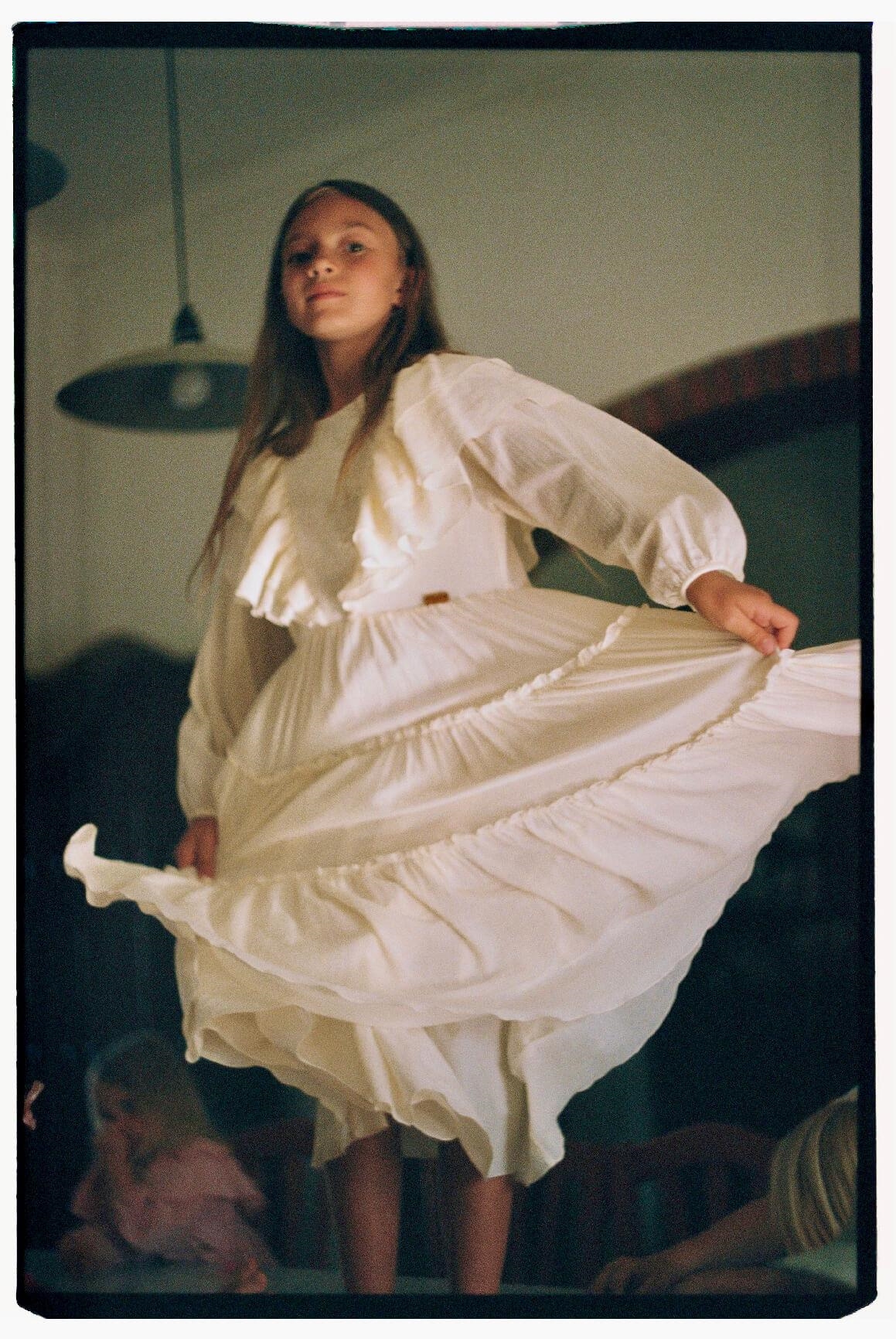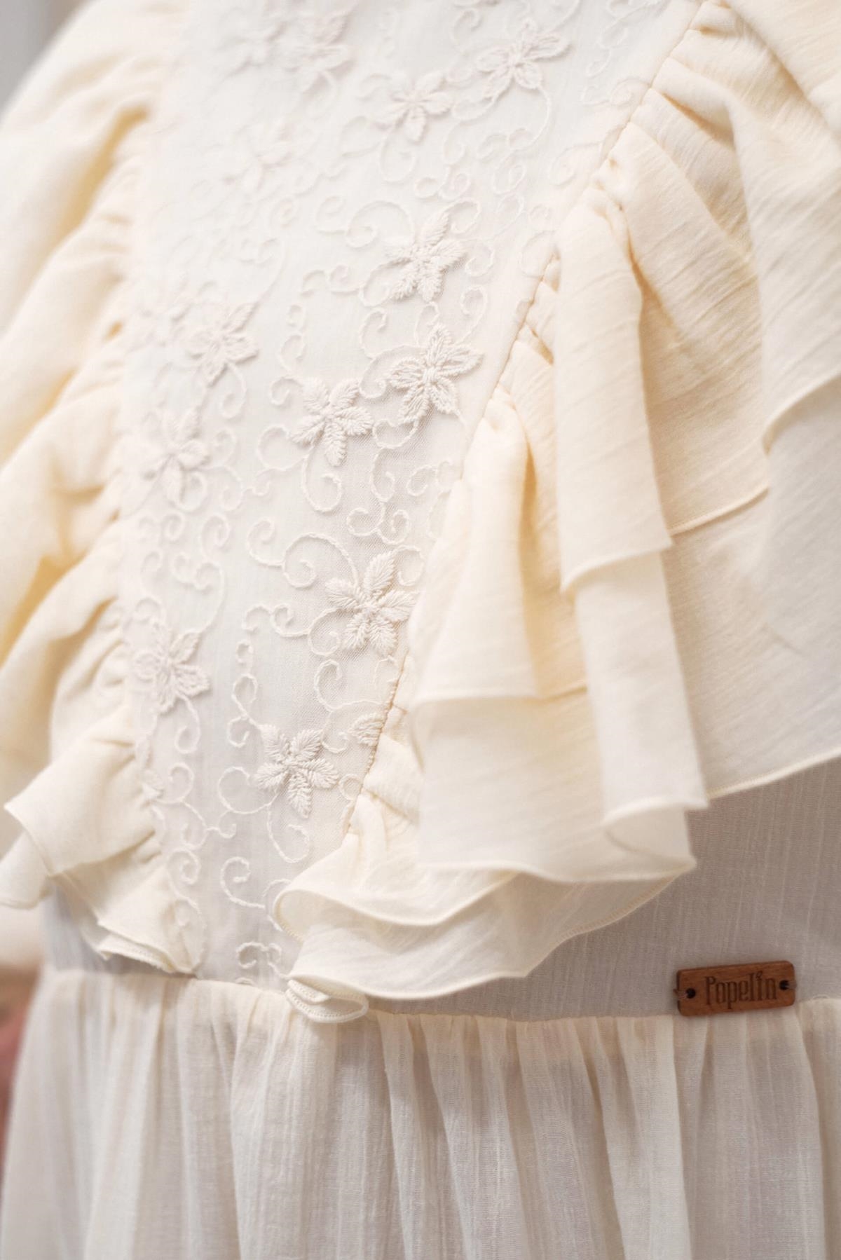 Ref. SS25 Mod 33.1 Off-white dress with triangular tulle yoke and frills