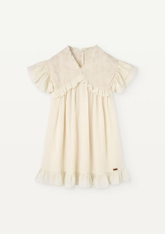 Gauze dress with floral embroidered tulle yokes. Frill detail on the bodice and neckline. Frilled sleeves. Button opening on the back. Frill at the bottom of the skirt. 100% organic cotton lining.