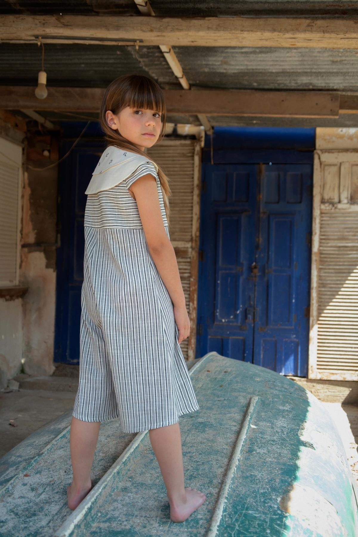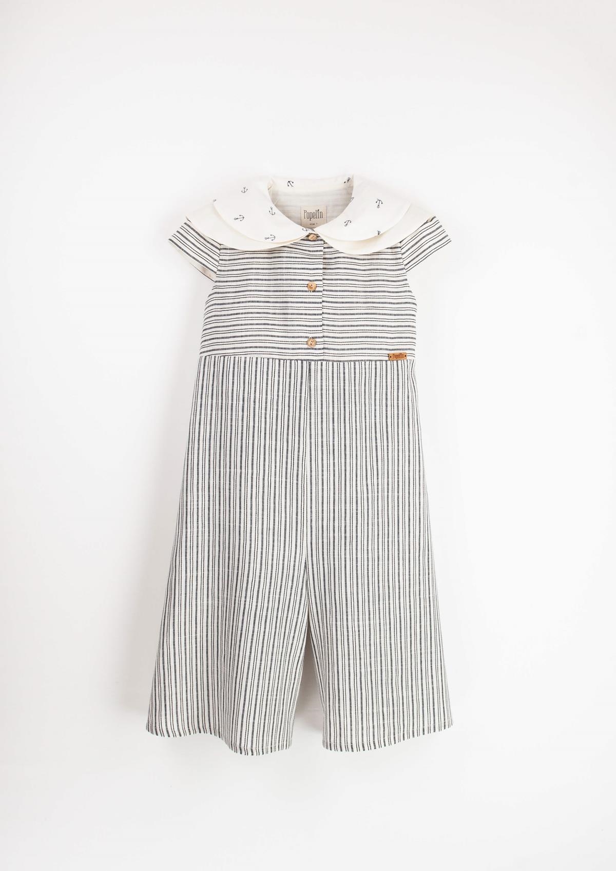 Midi trousers jumpsuit with double sailor collar. Midi trouser bottom with flare and short sleeves. 100% organic cotton lining.