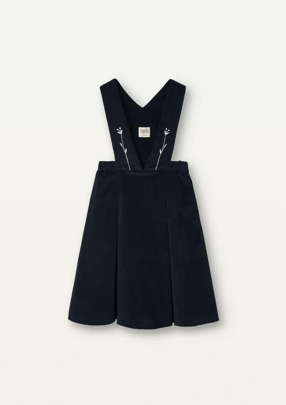 Dress with bib and embroidered straps. Front pleat on the skirt. Adjustable elasticated waist and side zip. 100% organic cotton lining. * below the knee.