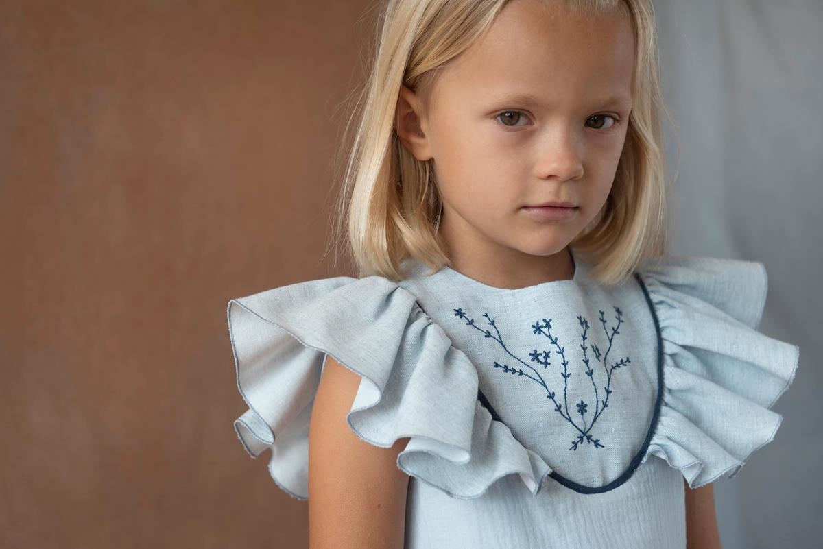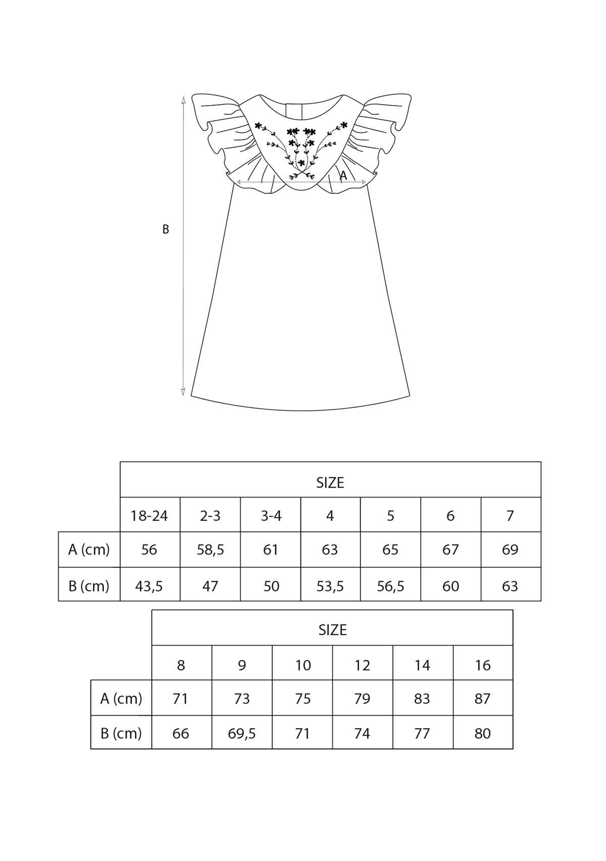 Short dress with cutaway sleeves, embroidered yoke and frill. Buttoned opening on the back. 100% organic cotton lining.