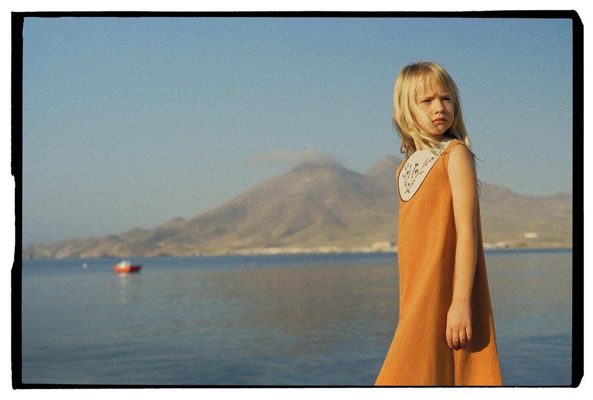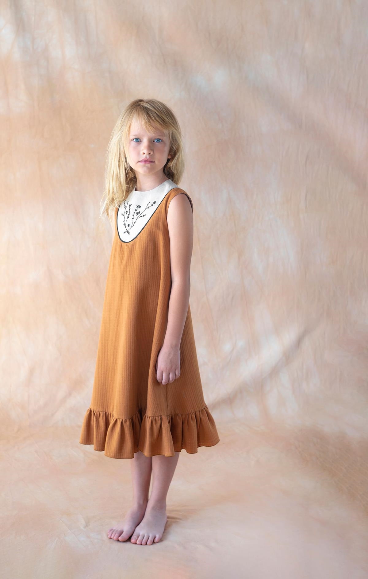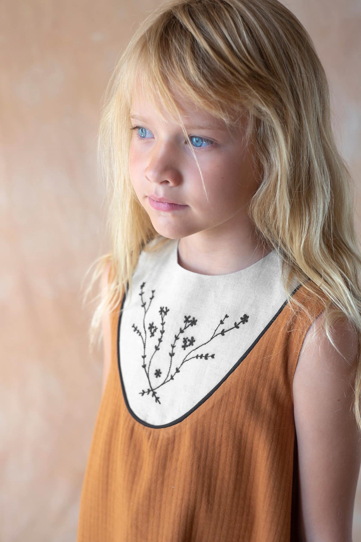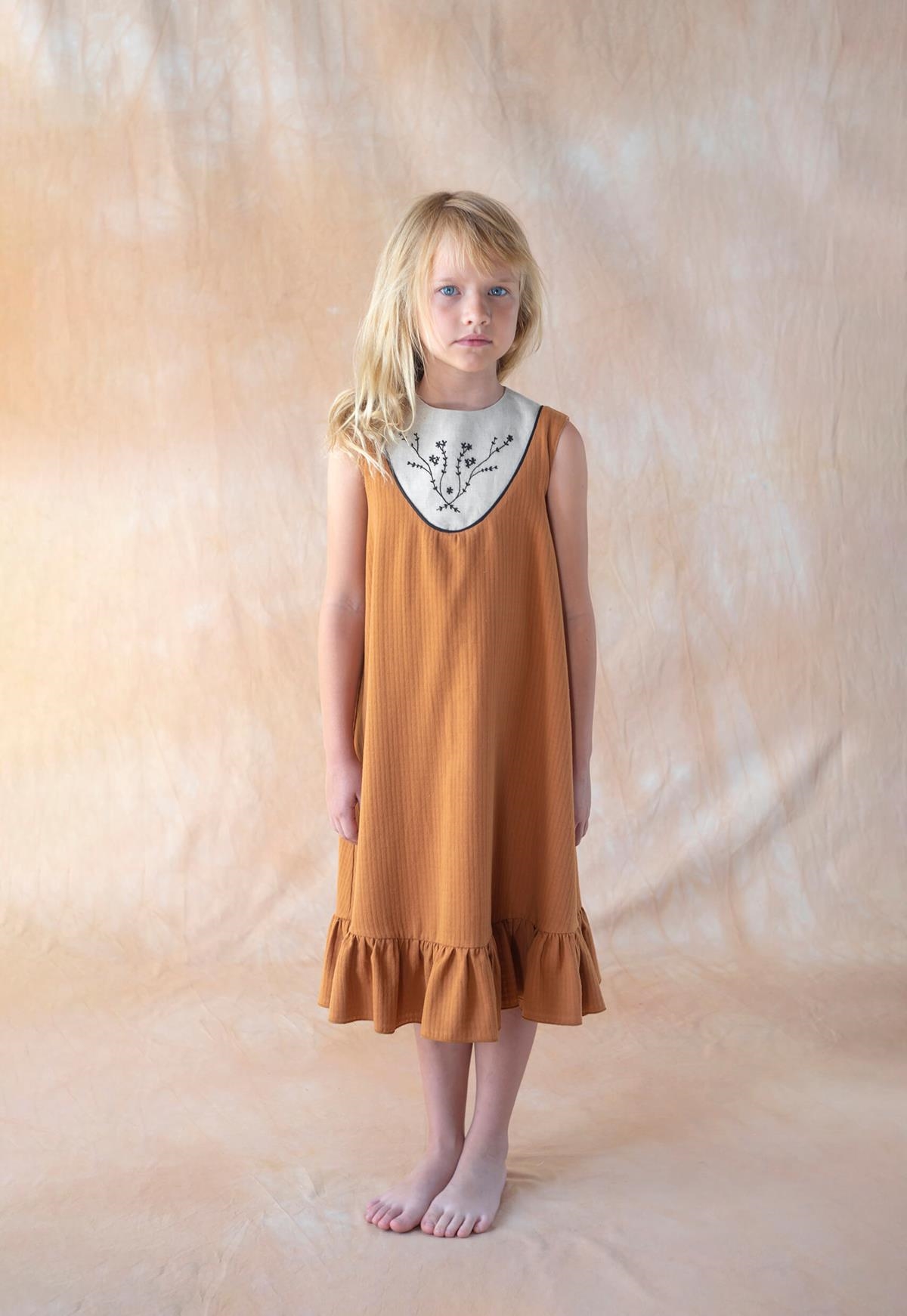 Midi dress with cutaway sleeves and embroidered yoke. Buttoned opening on the back. 100% organic cotton lining.