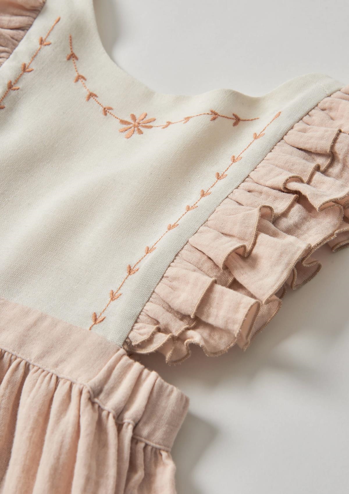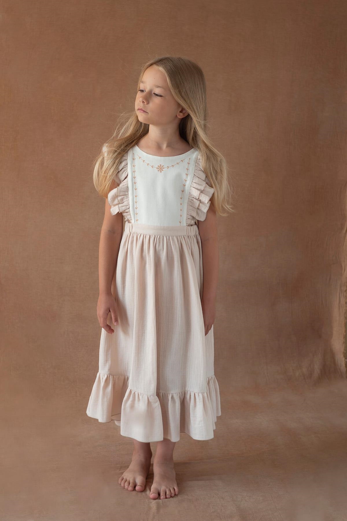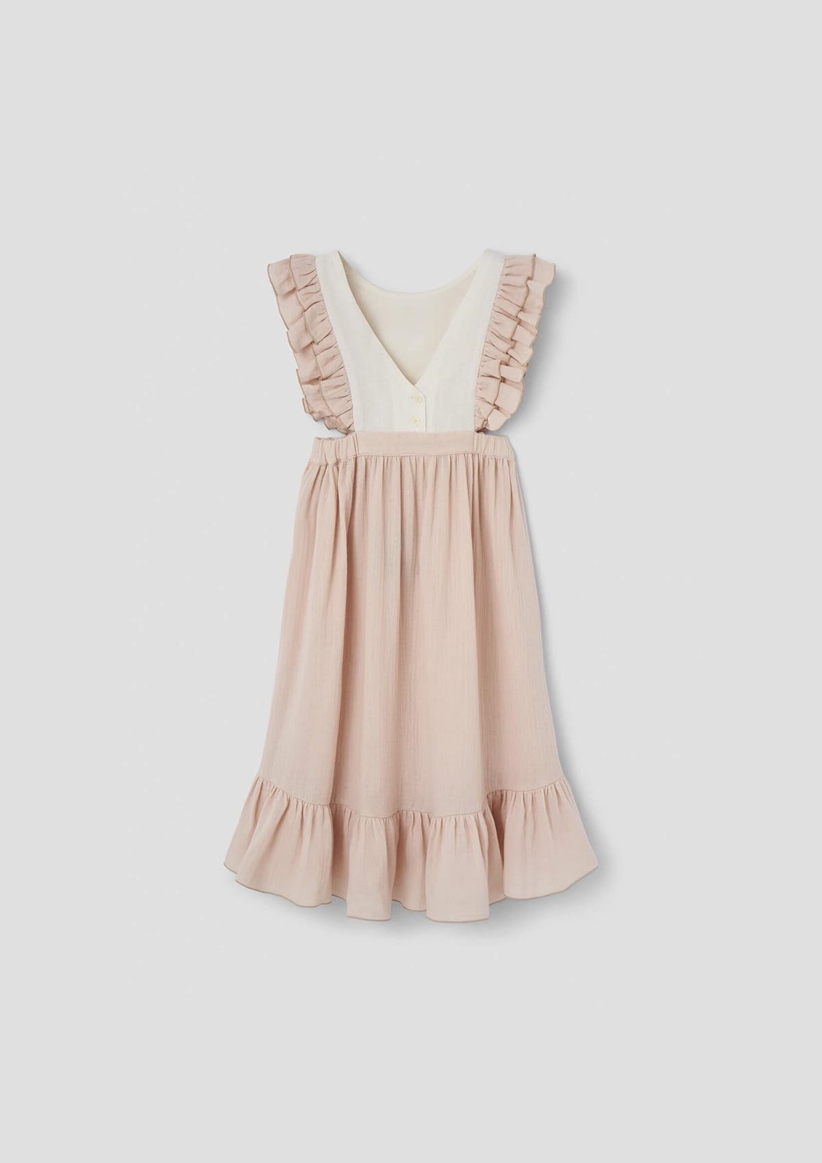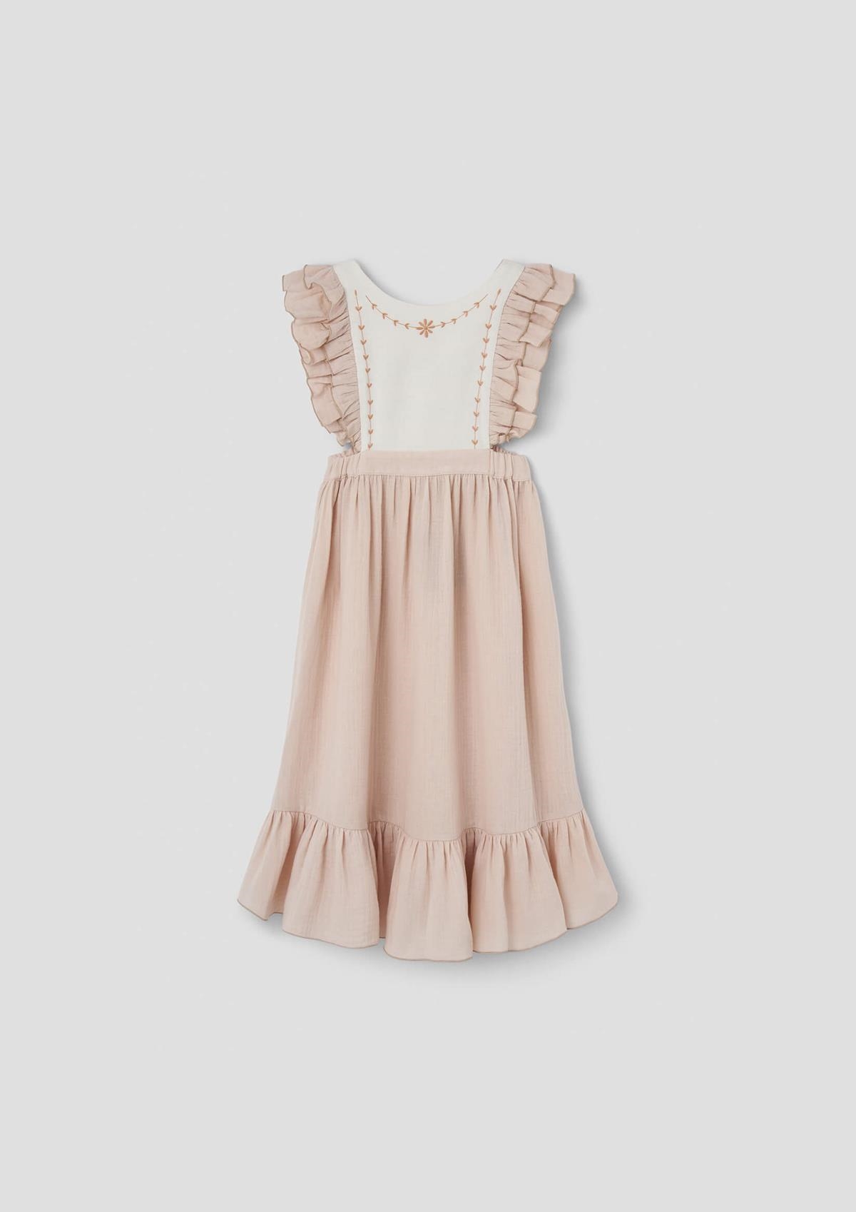 Midi bib dress with embroidery and appliqué. Double frill on the front and back. V back. Elasticated waist. Buttons for opening on the back. Body lined in 100% organic cotton.
