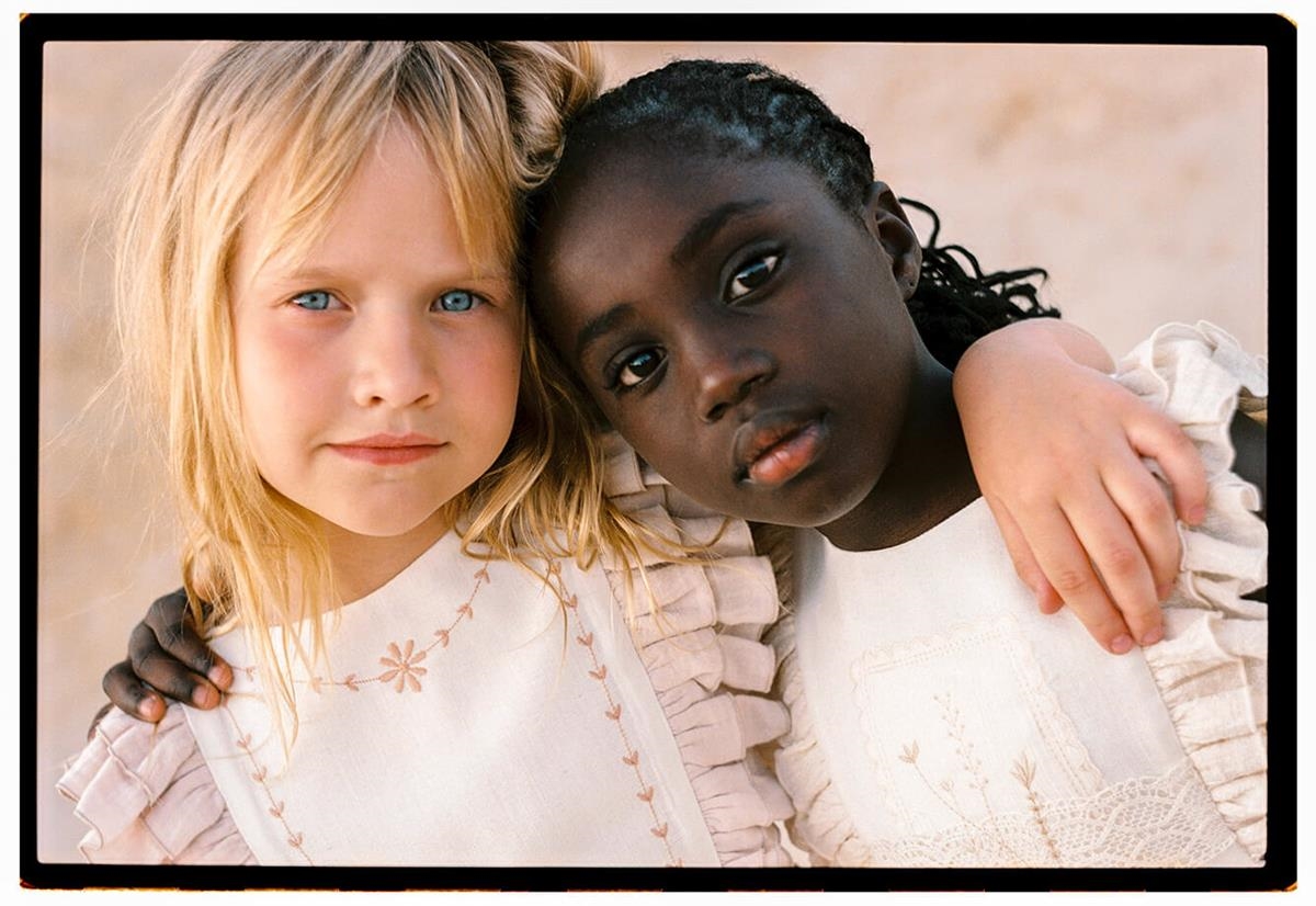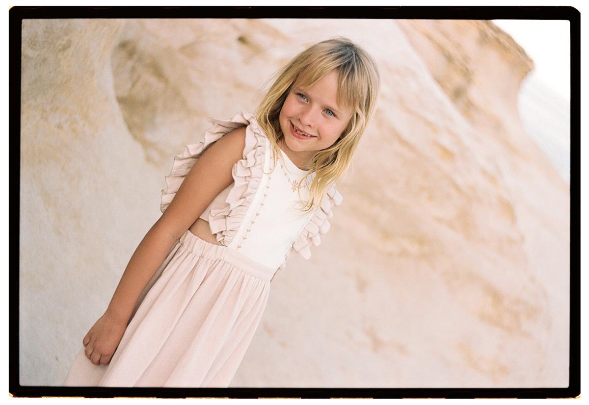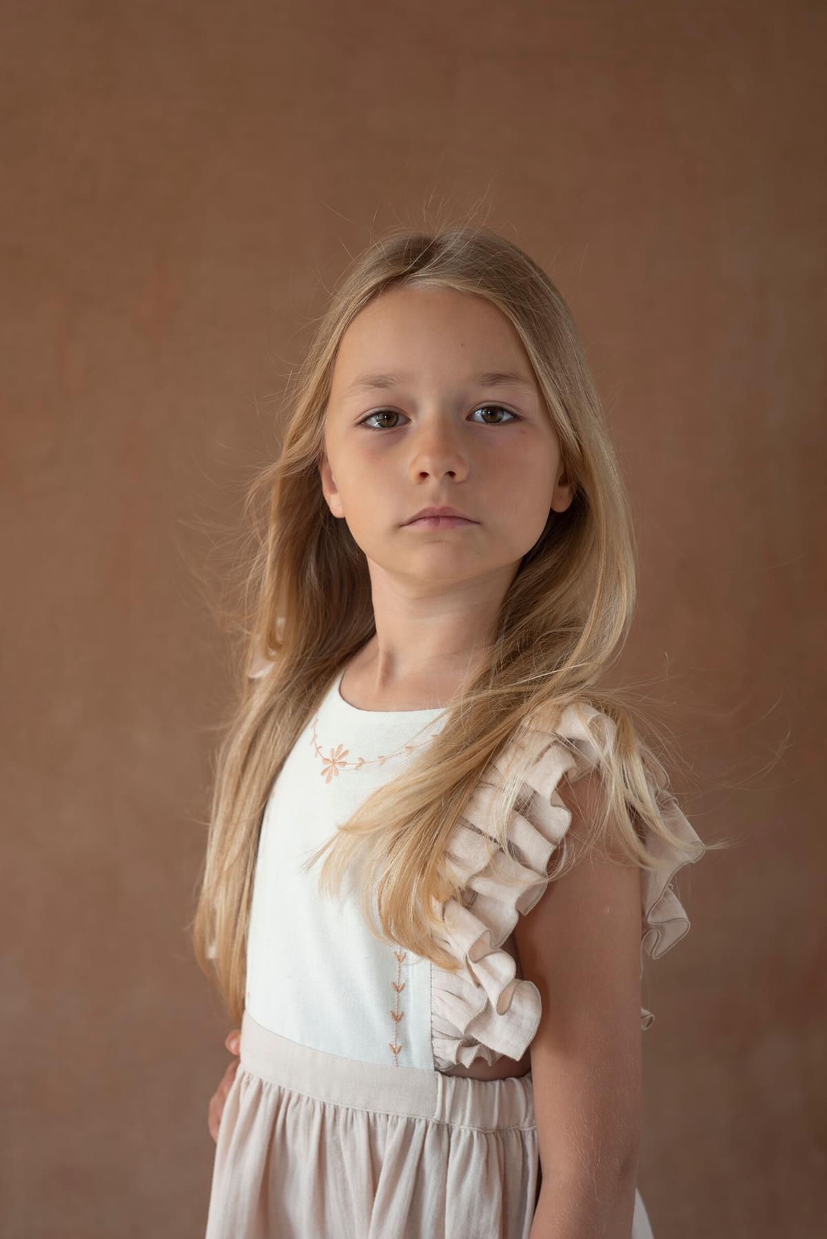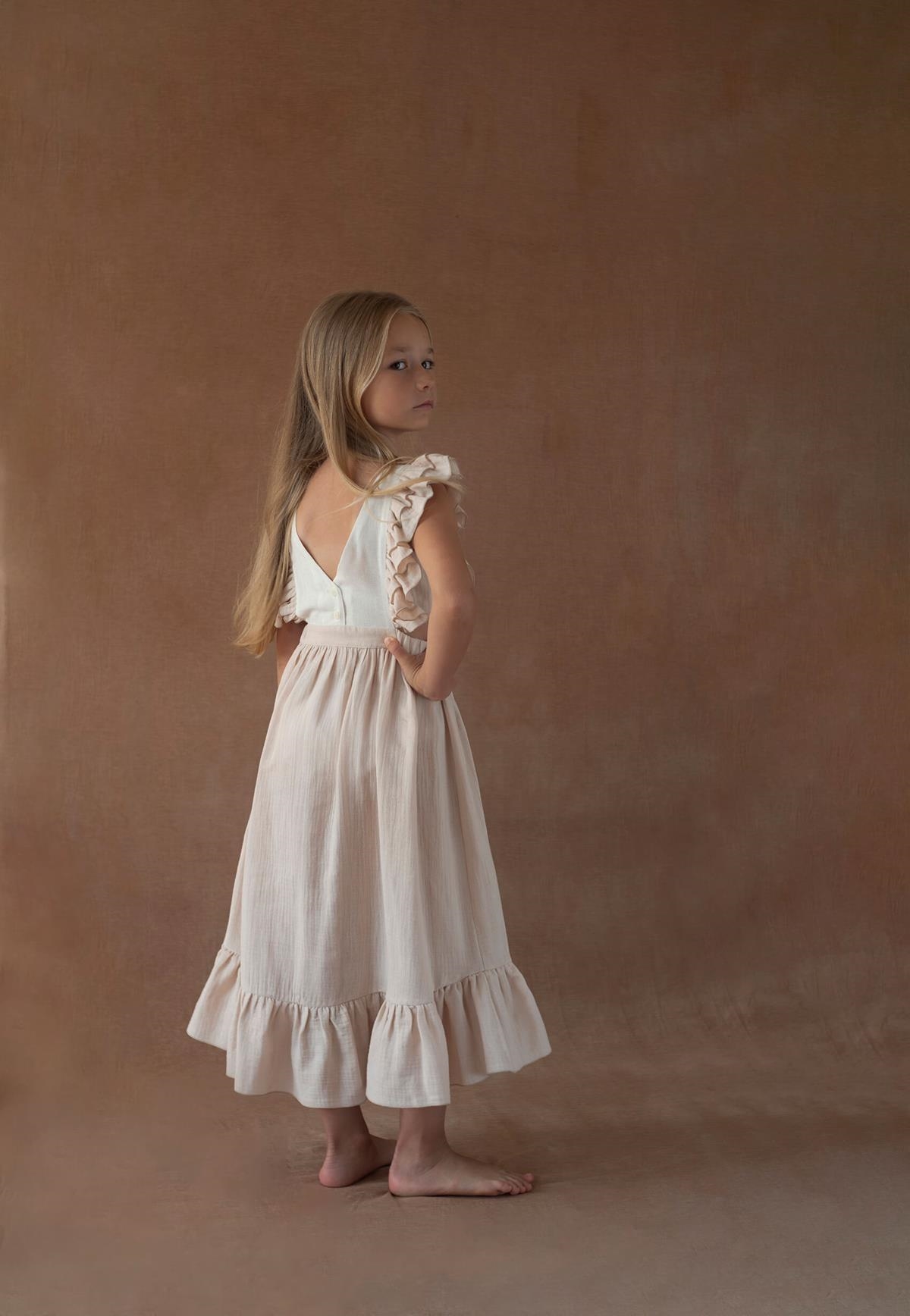 Midi bib dress with embroidery and appliqué. Double frill on the front and back. V back. Elasticated waist. Buttons for opening on the back. Body lined in 100% organic cotton.