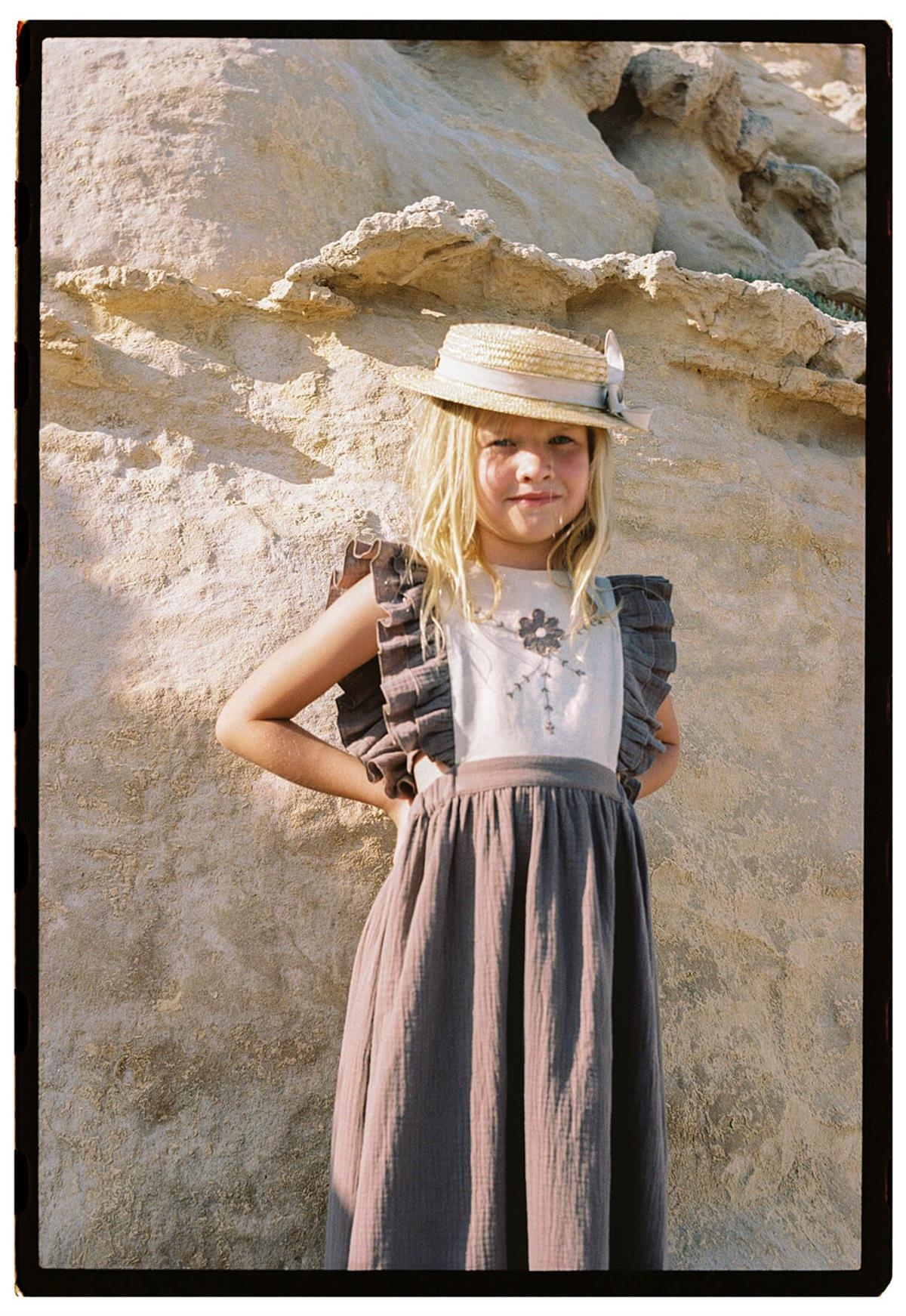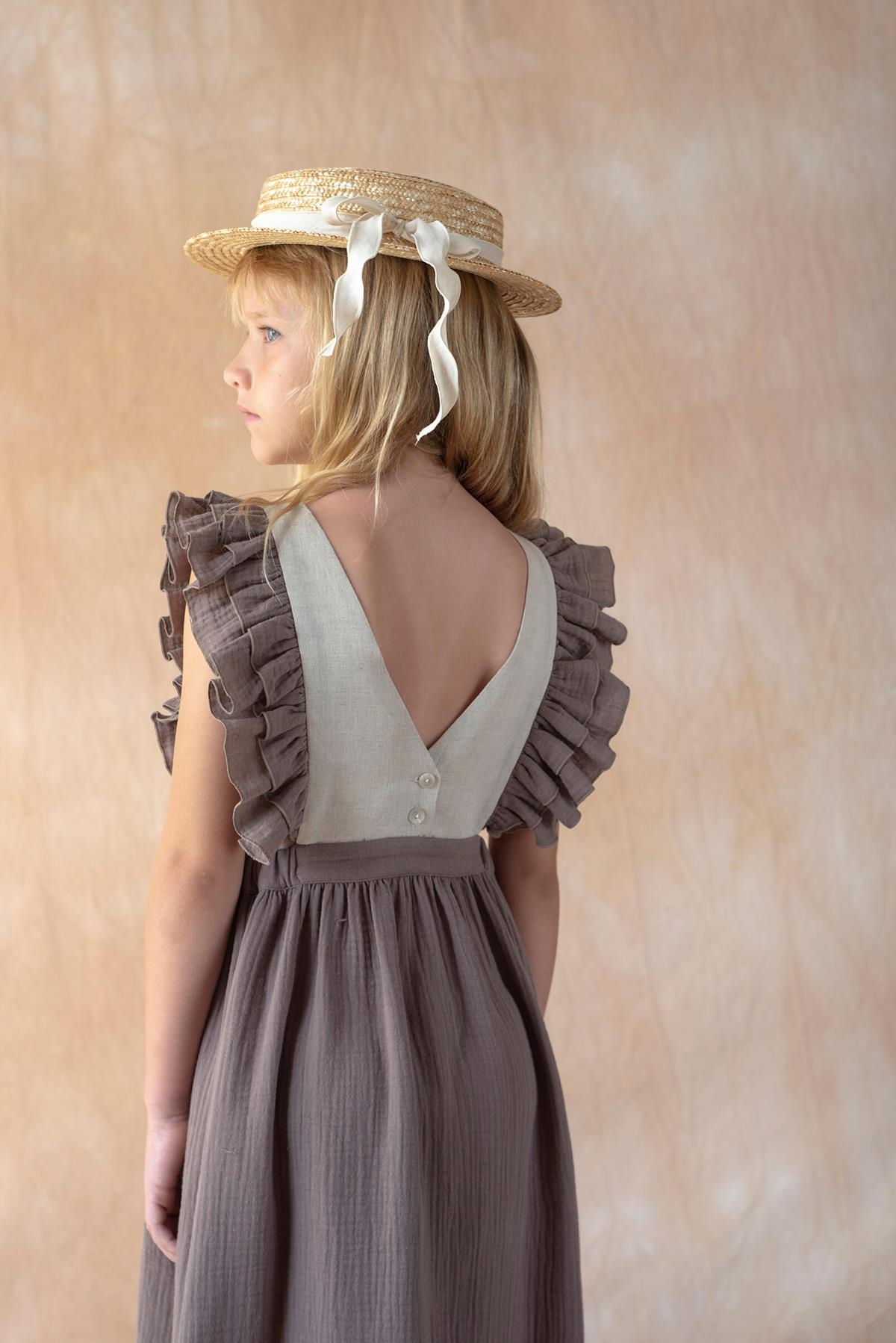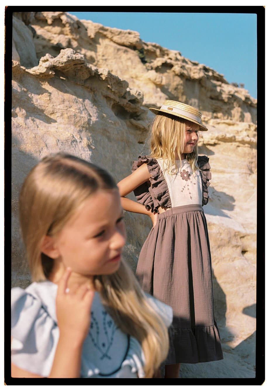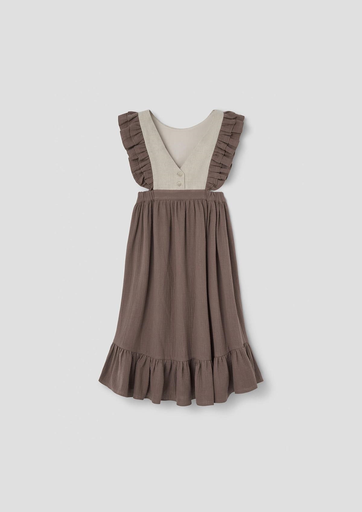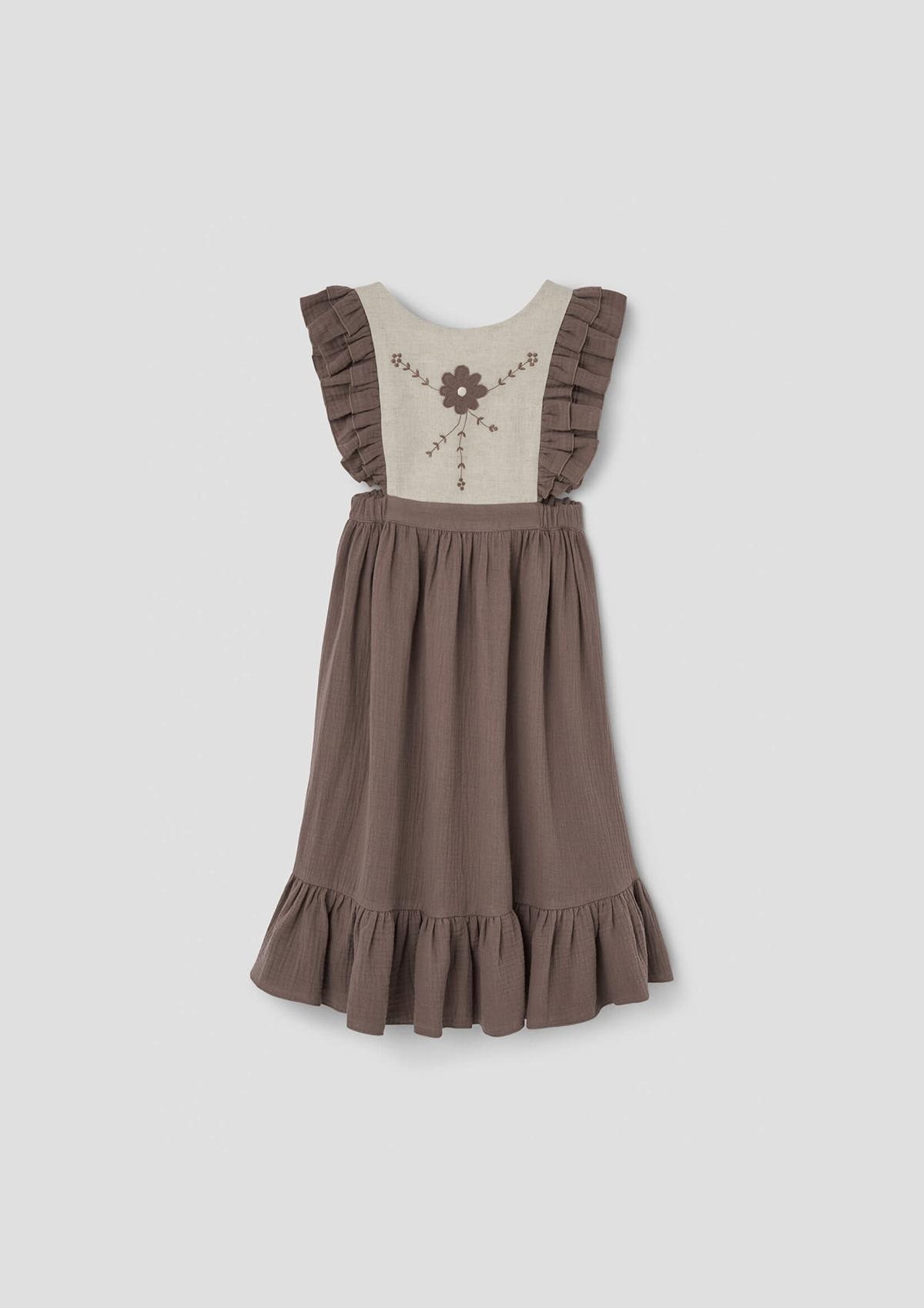 Midi bib dress with embroidery and appliqué. Double frill on the front and back. V back. Elasticated waist. Buttons for opening on the back. Body lined in 100% organic cotton.