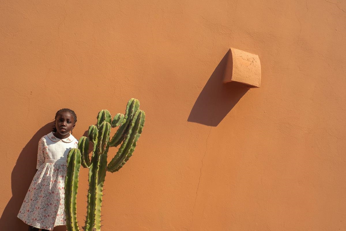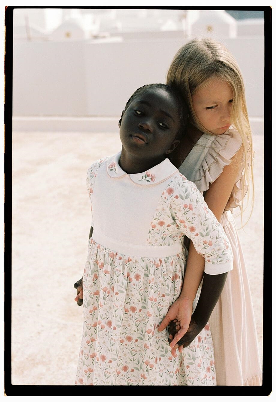 Dress with elbow-length sleeves and half cape skirt. Central yoke and embroidered baby collar with contrasting fabric. Adjustable rear waistline with fabric drawstring. 100% organic cotton lining.