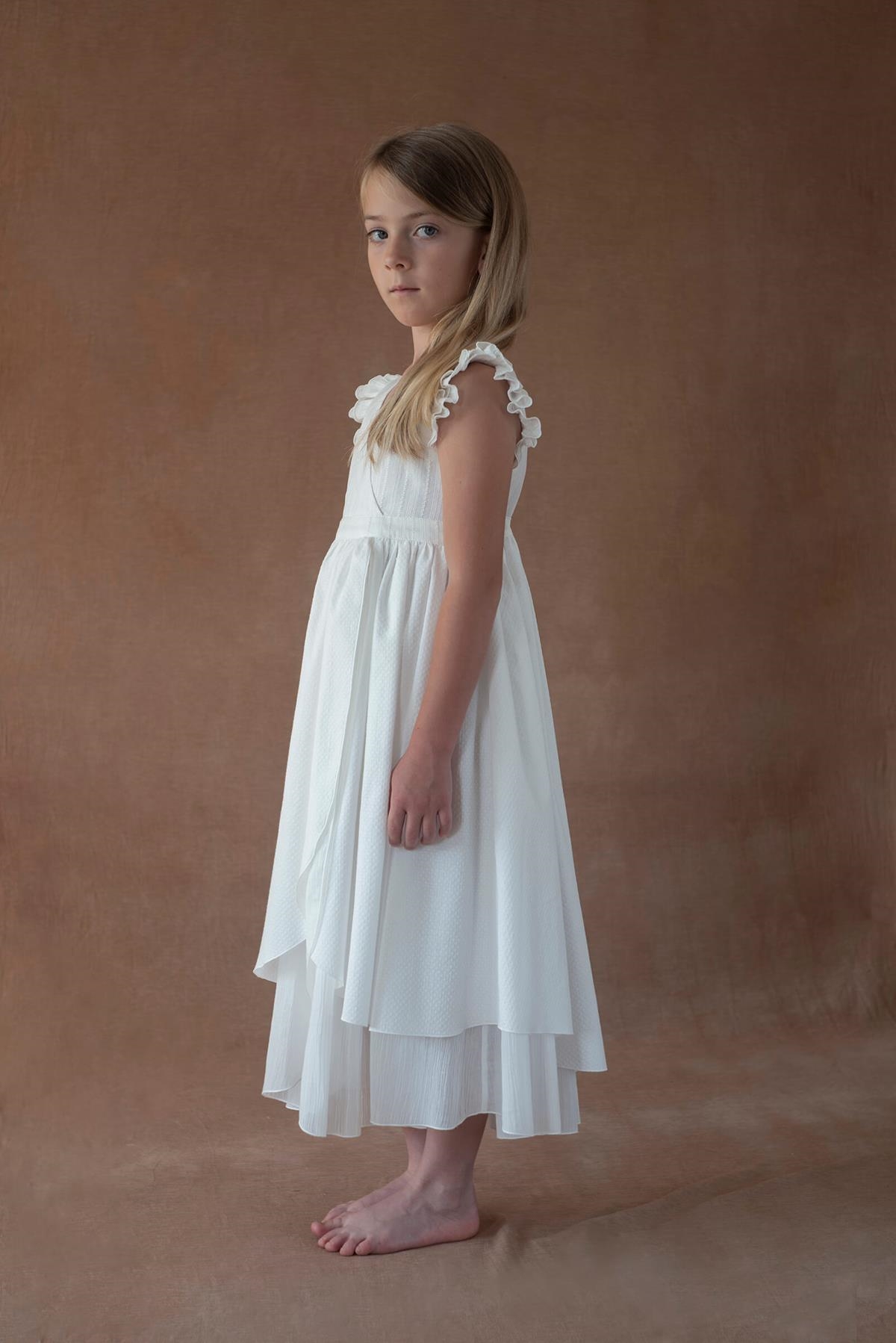 Dress with front and back crossover dip and double frill on the cutaway sleeves. Skirt with uneven double layer. Body lined in 100% organic cotton.