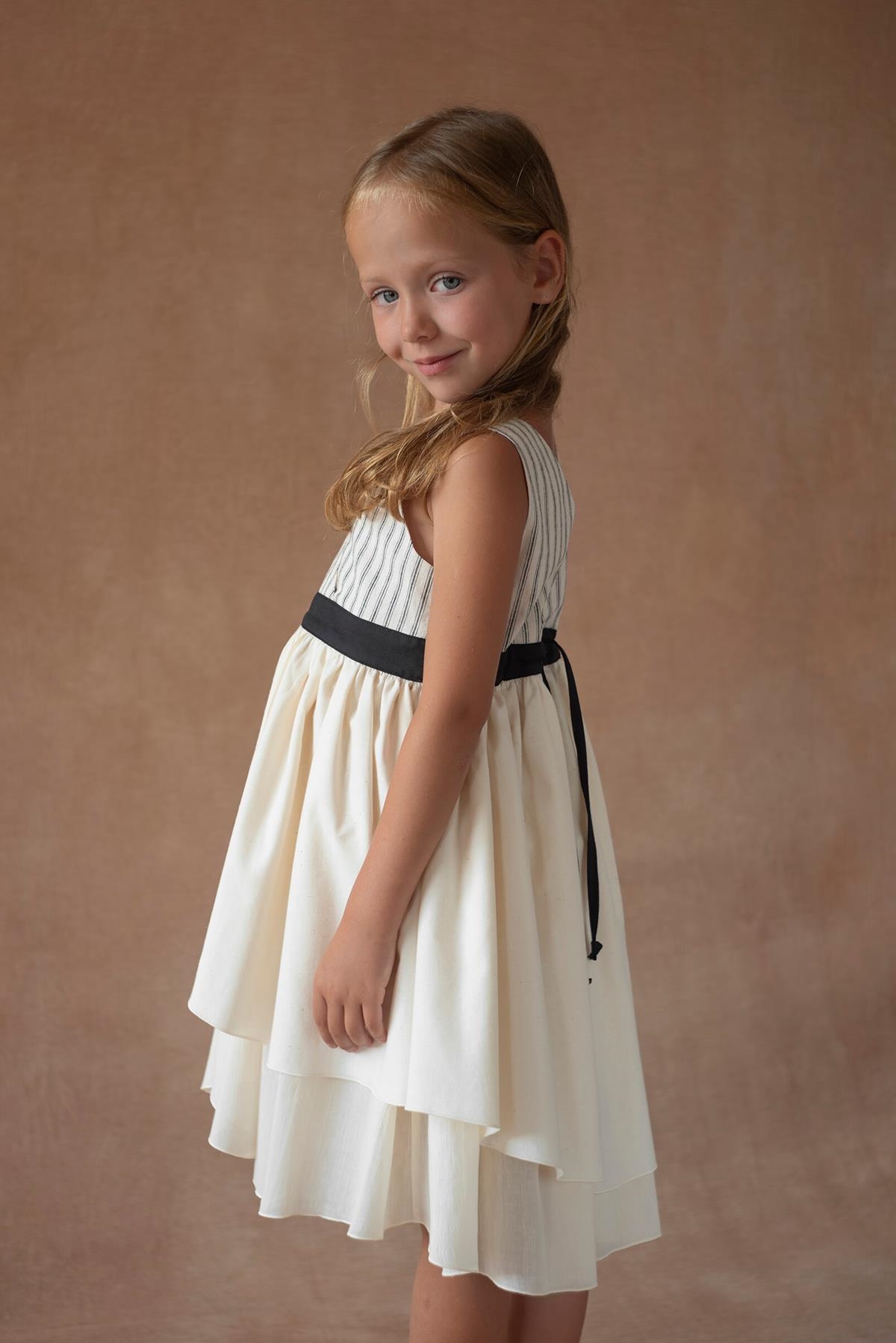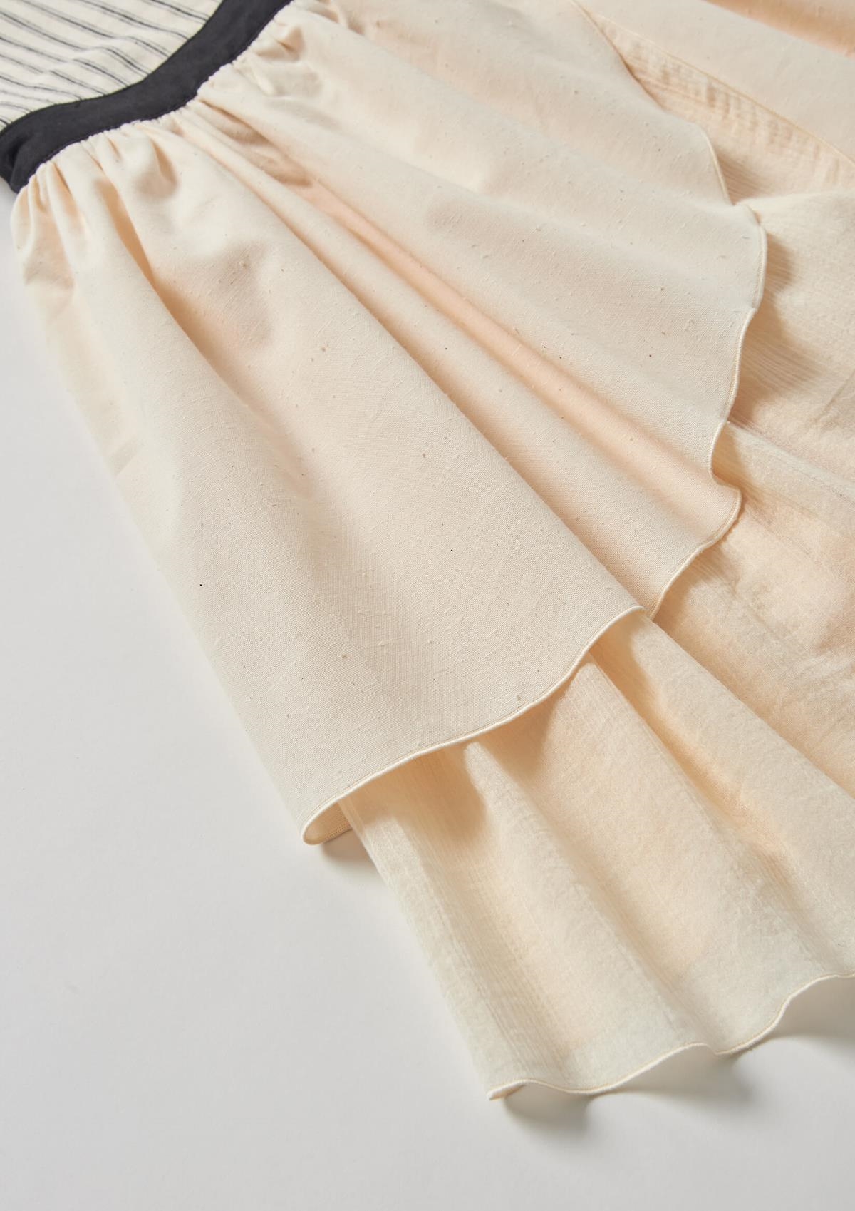 Dress with front and back crossover dip. Skirt with uneven double layer. Body lined in 100% organic cotton.