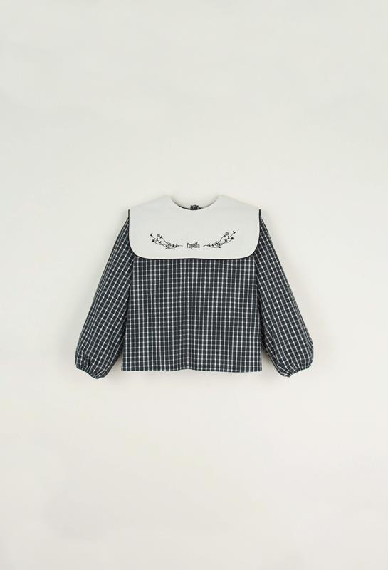 Ref. AW22.23 Mod.12.2 Black plaid embroidered organic fabric blouse with bib