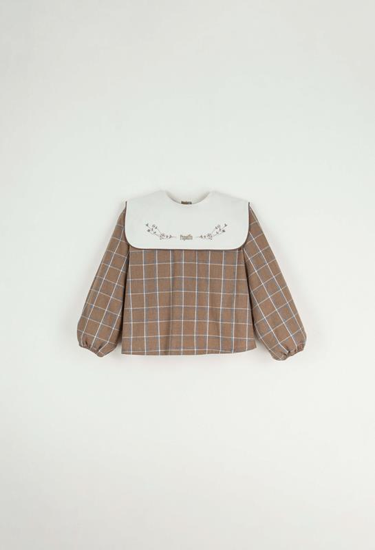 Ref. AW22.23 Mod.12.3 Terracotta plaid embroidered organic fabric blouse with bib
