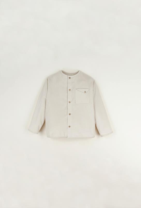 Corduroy shirt with peaked fold on the pocket and yoke on the back. Visible bias trim neckline, bottom and cuffs. Wooden button front opening.
