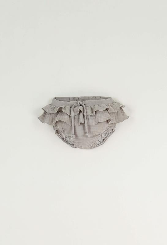 Double frill culotte with drawstring adjustable waist. 100% organic cotton lining.