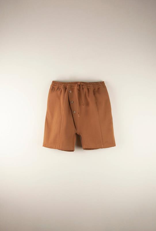 Bermuda shorts with sideways fly and wood buttons. Elasticated waist with adjustable drawstring. Side pockets and patch pocket on back.