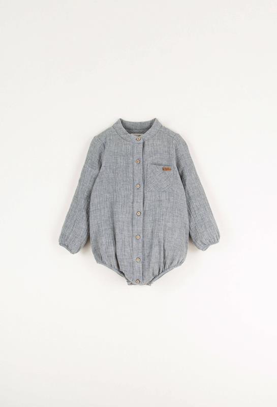 Shirt-style romper suit with pocket and Mandarin collar. Wooden button opening on the front and crotch. Elasticated cuffs.