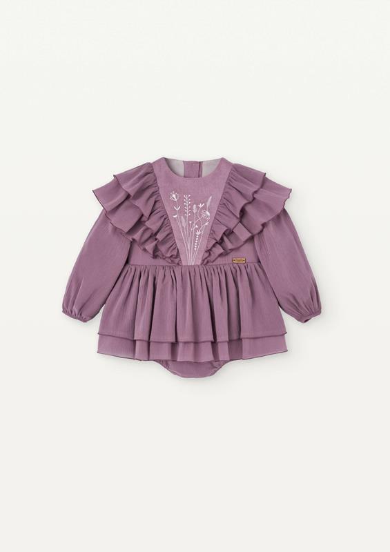 Ref. SS25 Mod 4.3 Mauve romper suit with embroidered triangular yoke and frills