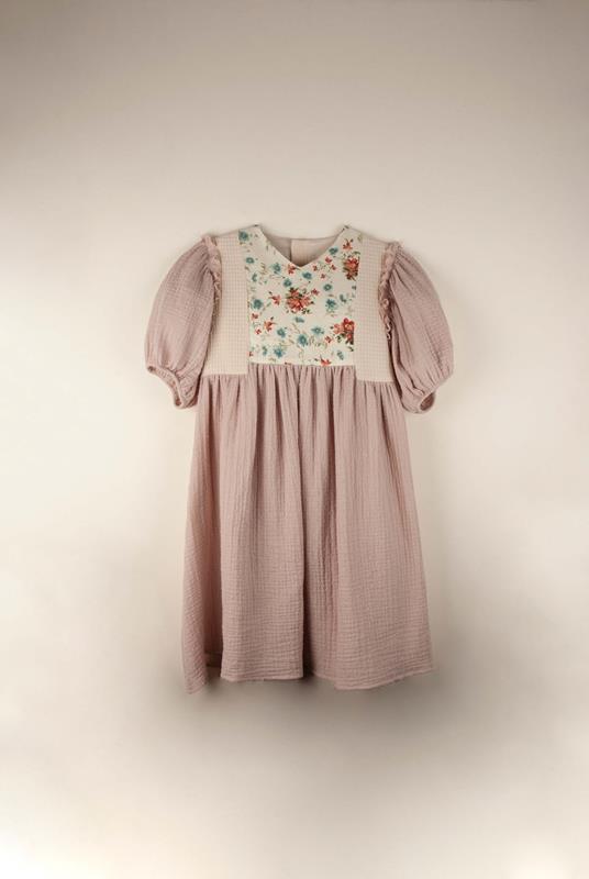 Organic dress with puffed sleeves and side panels and contrasting front. Opening on back with wood buttons. Bodice lined with 100% organic cotton.
