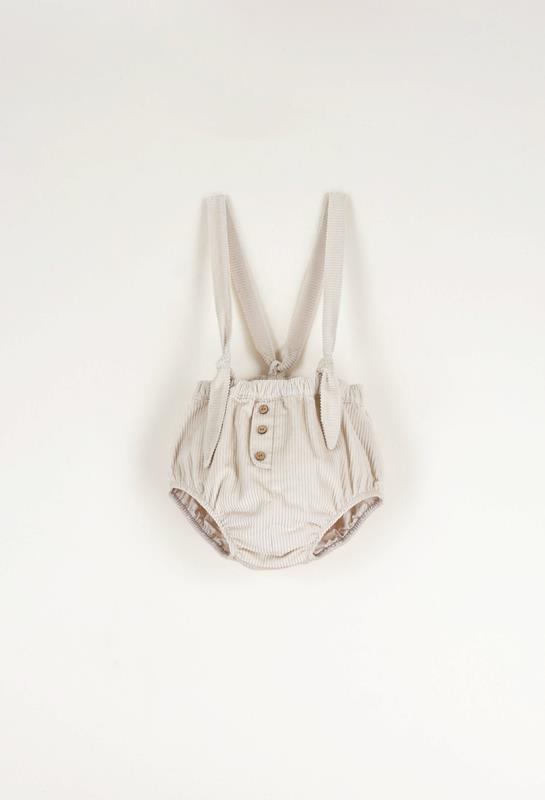 Culotte with faux placket and elasticated waist. Adjustable straps fastened at the front with a knot. 100% organic cotton lining.