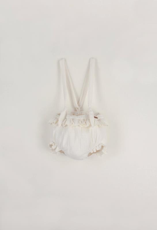 Culotte with mini frill at the waist and on the legs. Elasticated waist. Adjustable straps fastened at the front with a knot. 100% organic cotton lining.