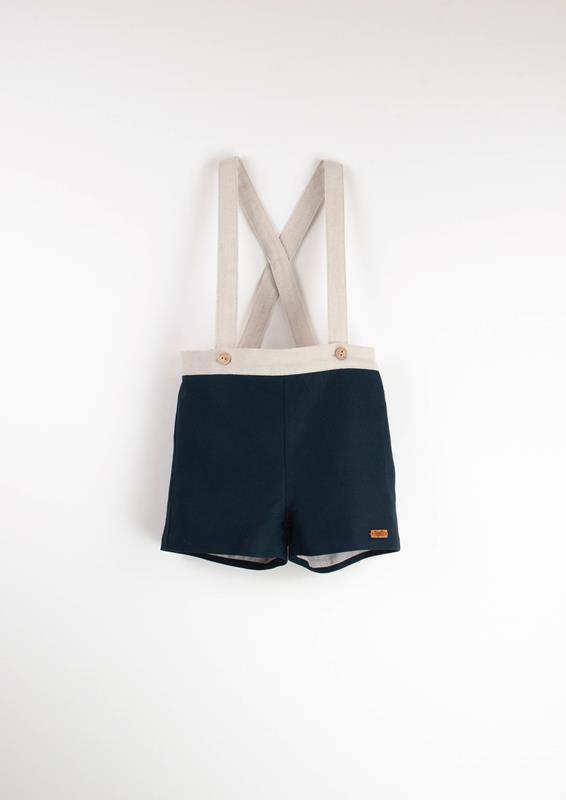 Short dungarees with contrasting adjustable straps. Wood button front closure. 100% organic cotton lining.