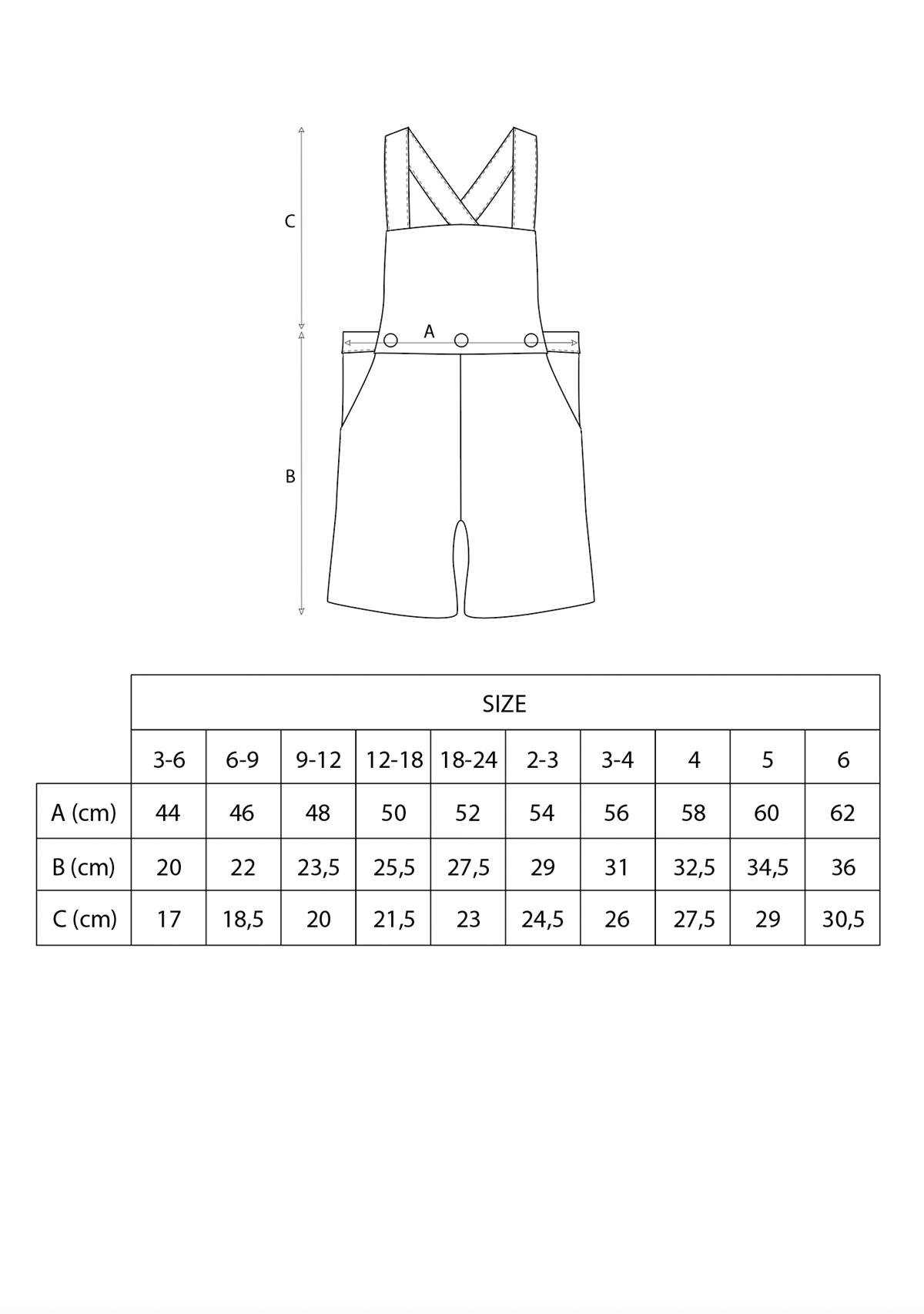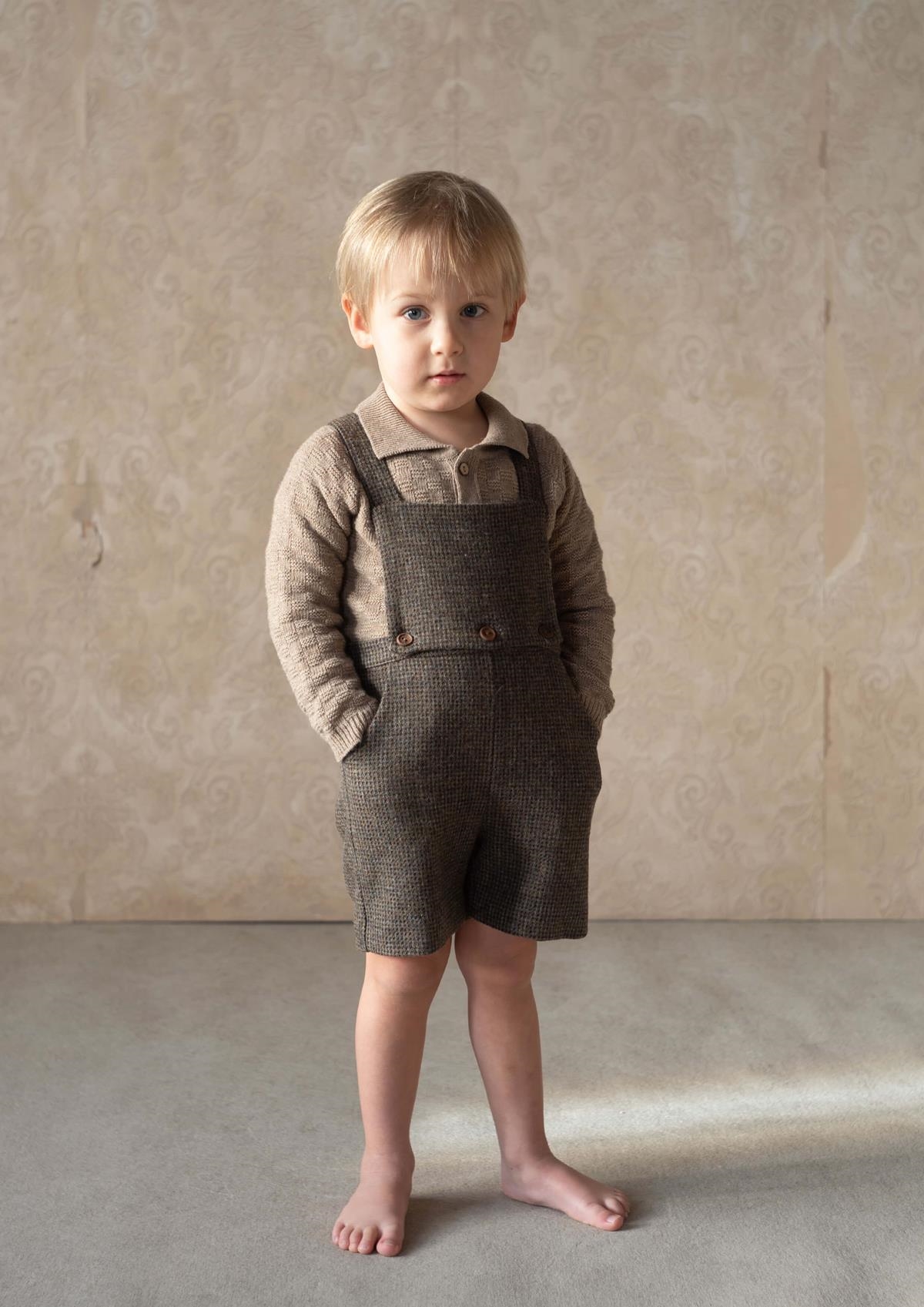 Romper suit with crossover straps and pockets. Elasticated waist. Wooden button opening on the front straps. Exclusive top-quality wool manufactured in Spain. 100% organic cotton lining.