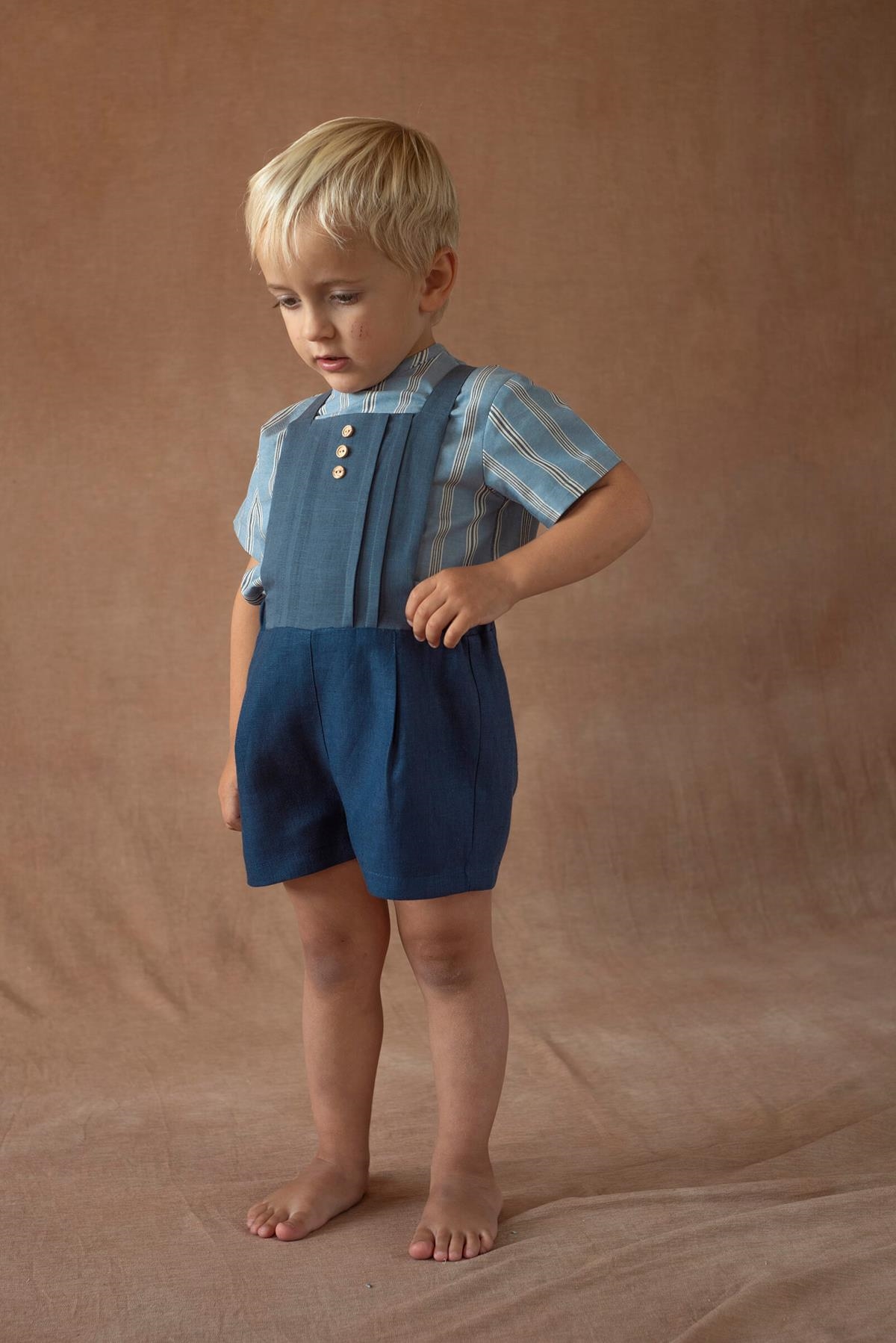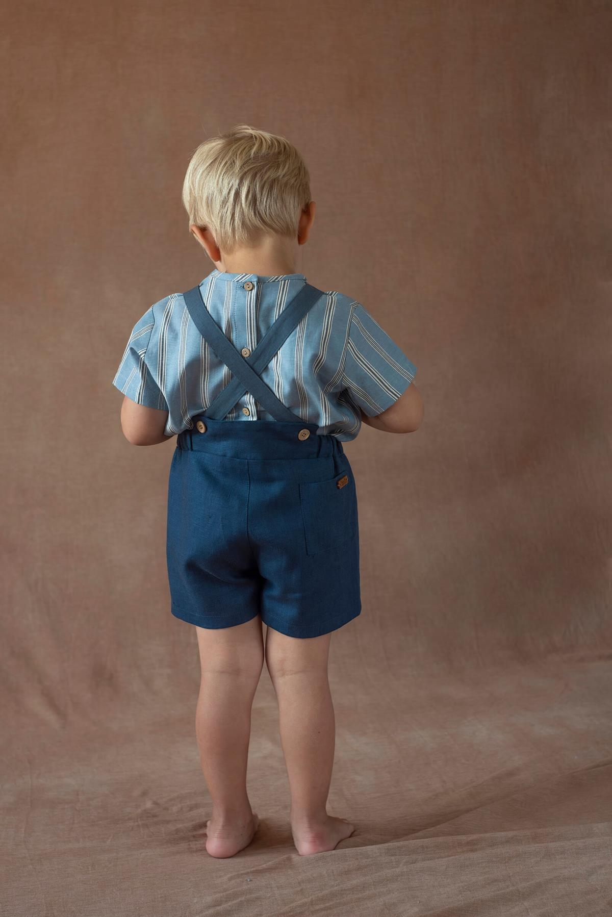 Short dungarees with front pleat and back pocket. Front of the dungarees with pleats and decorative buttons. Crossover straps fitted at the back with wooden buttons. Elasticated waist. 100% organic cotton lining.