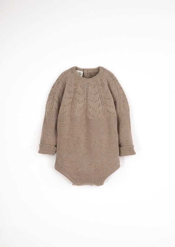 Knitted long-sleeved romper suit with round neckline. Exclusive design knitted in Spain using cashmere and top-quality wool. Wooden button opening on the back and crotch.
