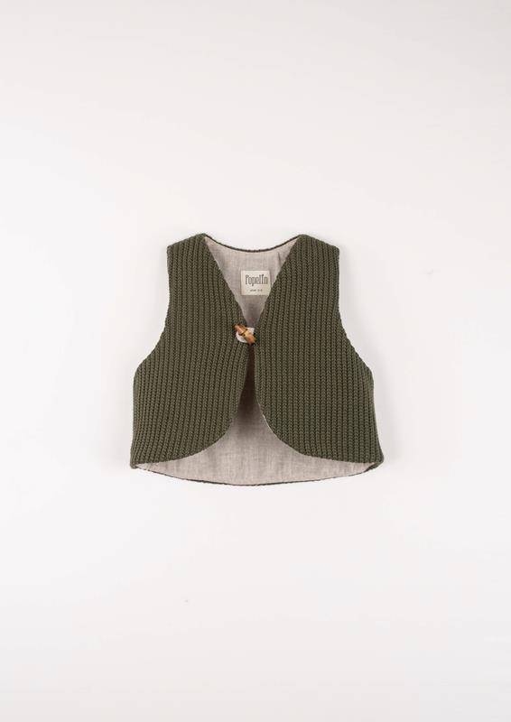 Knitted mini short waistcoat. Duffel coat button fastening on the front. 100% organic cotton lining.