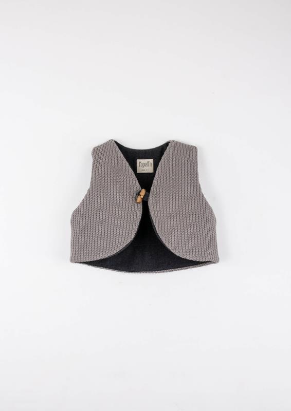 Knitted mini short waistcoat. Duffel coat button fastening on the front. 100% organic cotton lining.
