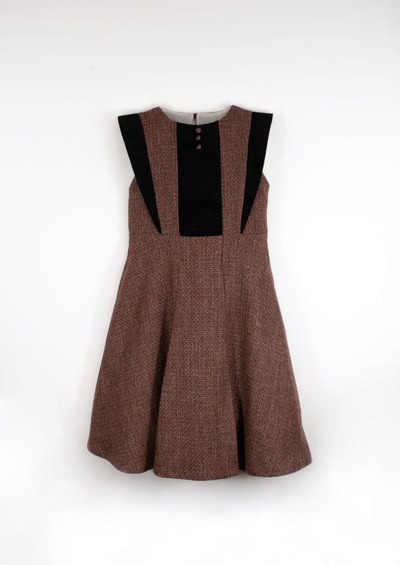Dress with gusseted skirt and cutaway sleeve with layer feature on the shoulders. Rear opening with covered buttons and side zip. Exclusive top-quality wool manufactured in Spain. 100% organic cotton lining.