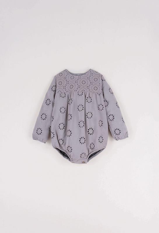 Ref. AW22.23 Mod.4.1 Grey organic fabric romper suit with Swiss embroidery