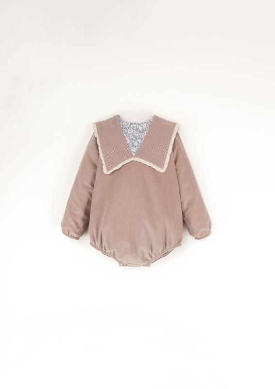 Long-sleeved corduroy romper suit with oversized bib collar. Wooden button opening on the back and crotch. Elasticated cuffs. 100% organic cotton lining.