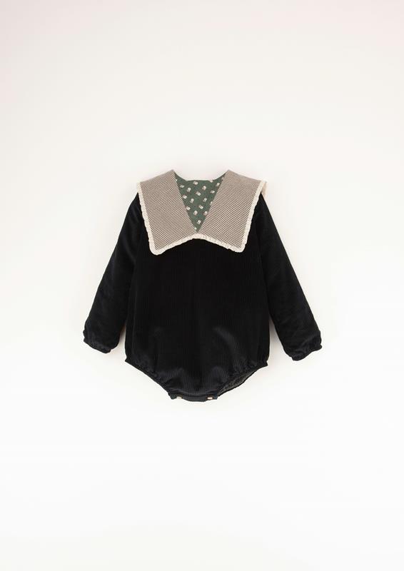 Long-sleeved corduroy romper suit with oversized bib collar. Wooden button opening on the back and crotch. Elasticated cuffs. 100% organic cotton lining.