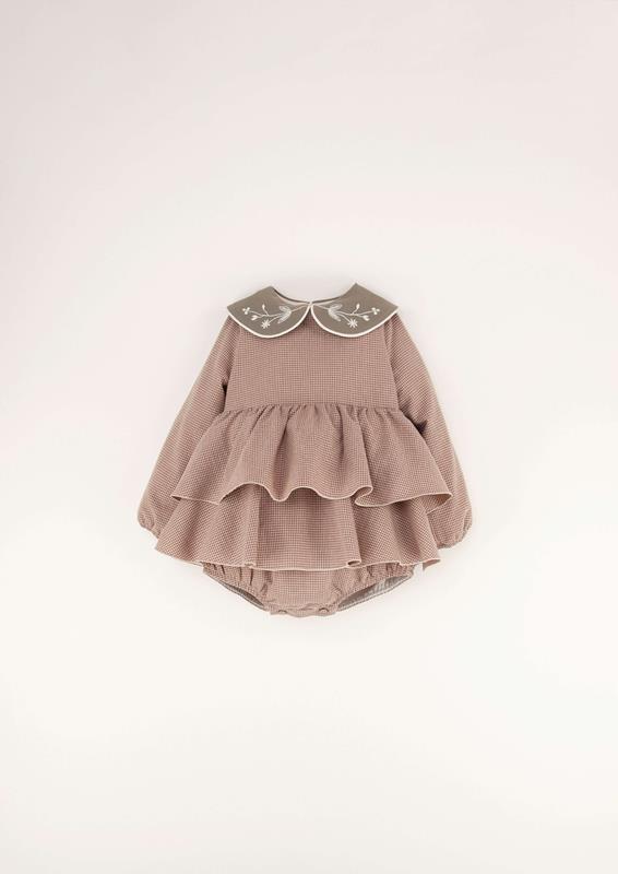 Long-sleeved romper suit with double frill and baby collar with artisan embroidery. Wooden button opening on the back and crotch. Elasticated cuffs. 100% organic cotton lining.