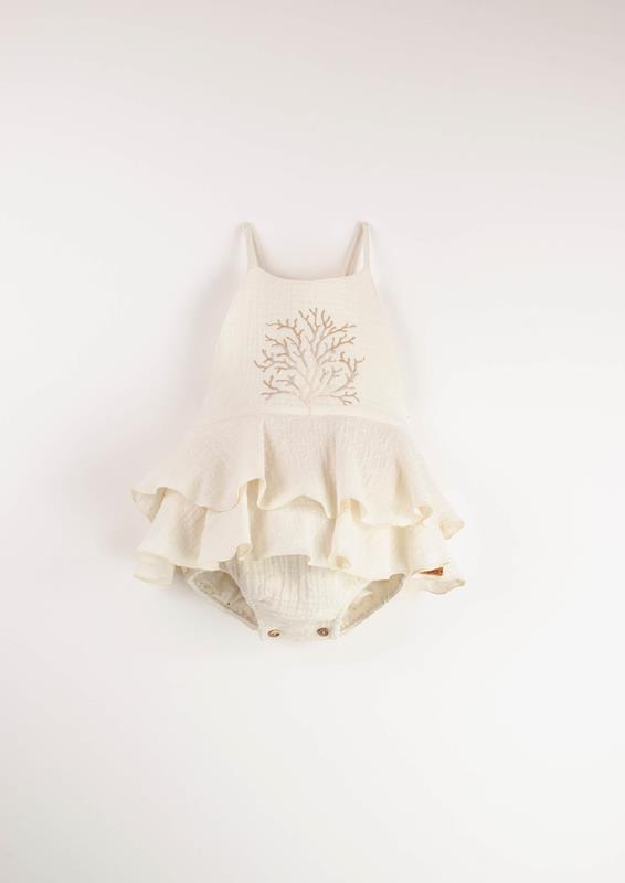 Romper suit with skirt and straps. Open back and artisan embroidery on the front. Back with adjustable straps and elasticated waist. 100% organic cotton lining.